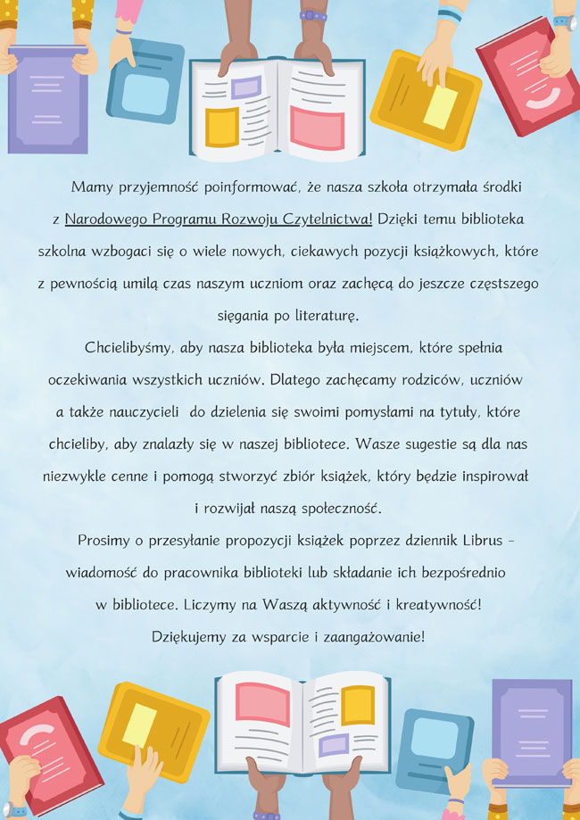 Z radością informujemy, że dzięki wsparciu Narodowego Programu Rozwoju Czytelnictwa nasza szkolna biblioteka wzbogaciła się już o 212 nowych, ciekawych tytułów, które czekają na Was! NPRCZ wspiera szkoły w zakupie wartościowej literatury, aby każdy z Was miał dostęp do inspirujących historii, pomocnych książek popularnonaukowych i ważnych lektur.