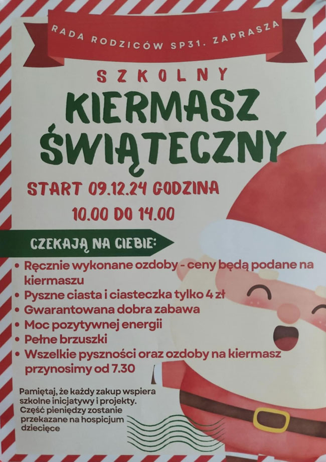 Rada Rodziców serdecznie zaprasza na kiermasz Świąteczny. 9. 12. poniedziałek w godzinach 10-14.