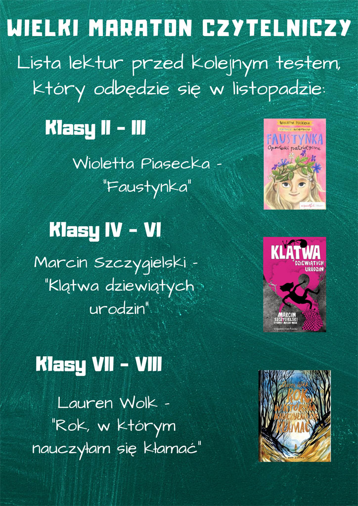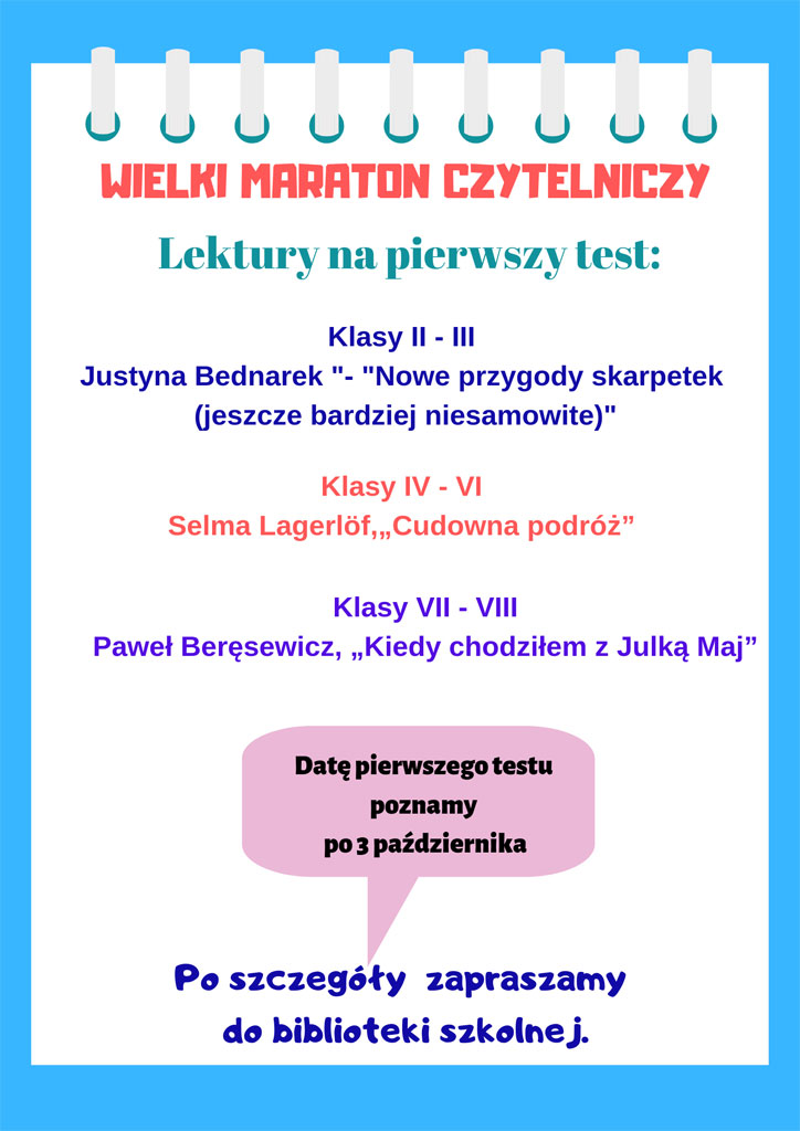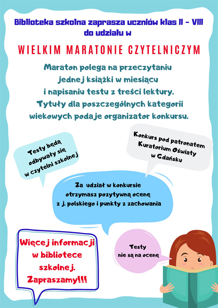Pamiętajcie, do Maratonu Czytelniczego można przystąpić w każdej chwili. Wszystkich chętnych zapraszamy do biblioteki szkolnej.