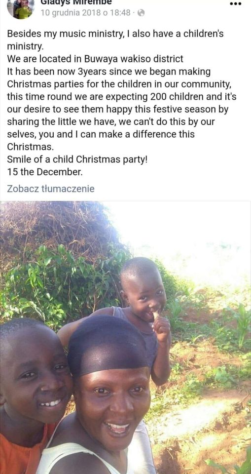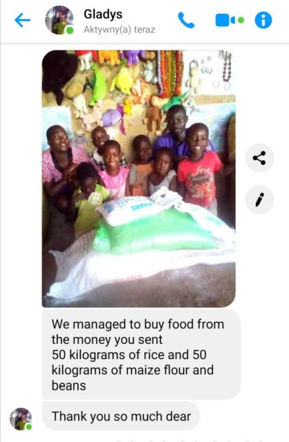 with the World w sprawie zbiórki pieniędzy i zapewniła, że przekazane środki Pani Gladys Mirembe przeznaczy na zakup żywności dla