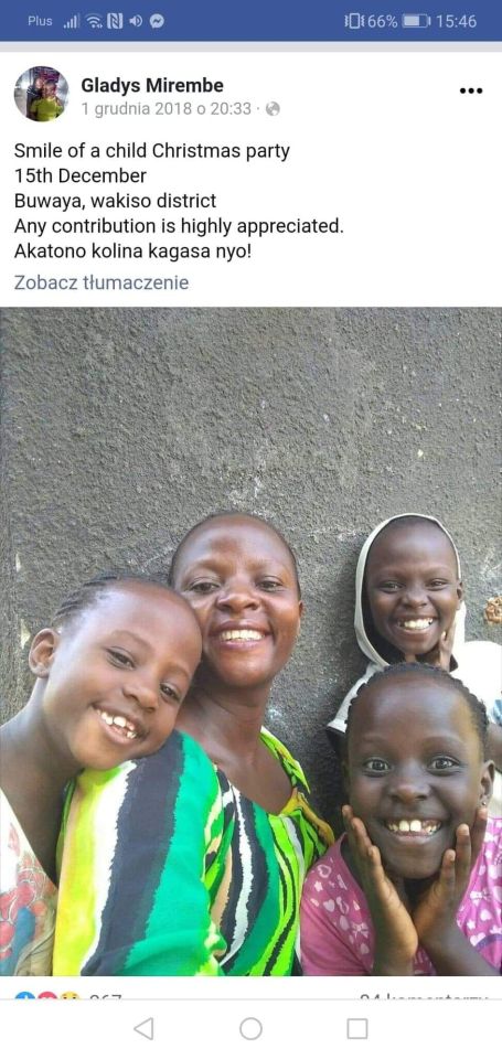 Wielka radość Pani Gladys Mirembe. Dzięki przelanym na jej konto pieniądzom, a darczyńcami była Pani Anna Jachimska, Pani Bożena Konrad, Pani Monika Czajka - Pietroczuk,