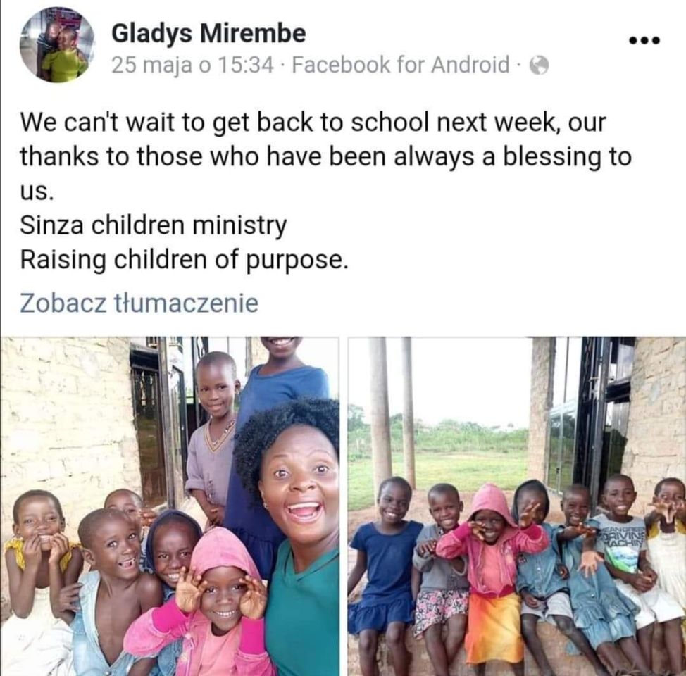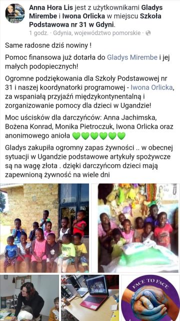 Pani Gladys Mirembe ogromnie jest wdzięczna naszej szkole za okazane jej podopiecznym serce i pomoc.Dziękuje Panu Dyrektorowi za zaangażowanie. Pozdrawia całą szkołę. Do jej dzieci po raz pierwszy trafią paczki z darami.