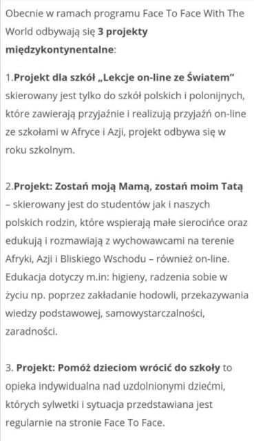 W ramach projektu Face to Face with the World nasza szkoła prowadzi lekcje online z dziećmi z Ugandy. Oprócz tego zbierane i wysyłane są dla nich dary. W ramach projektu można udzielić pomocy także w inny sposób. Jednak jest to już dla chętnych.