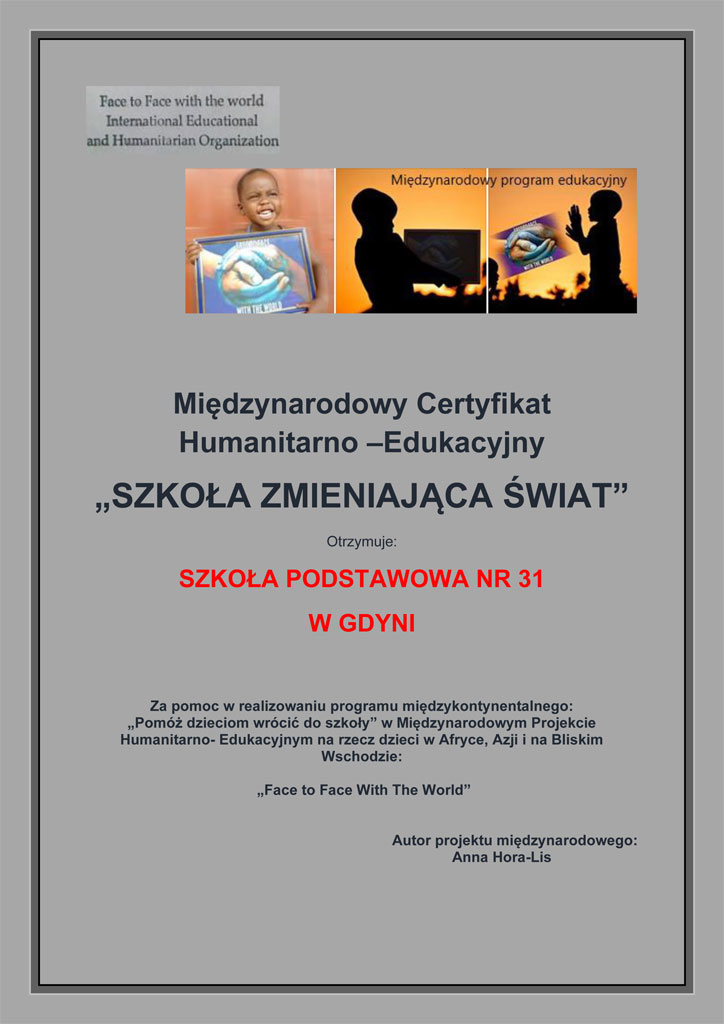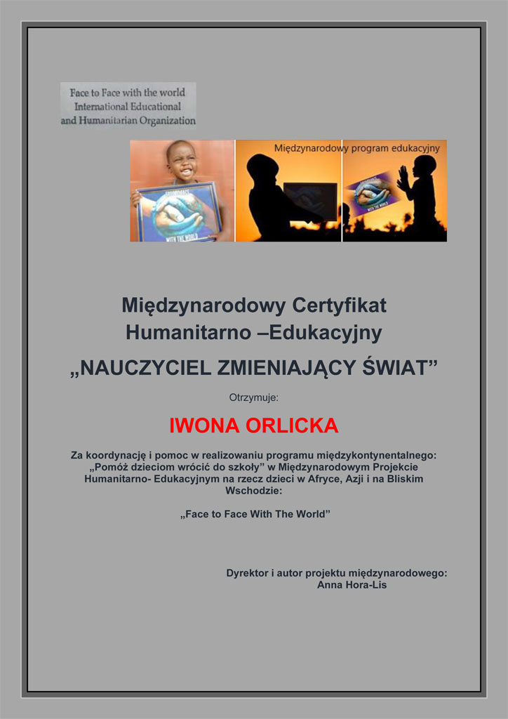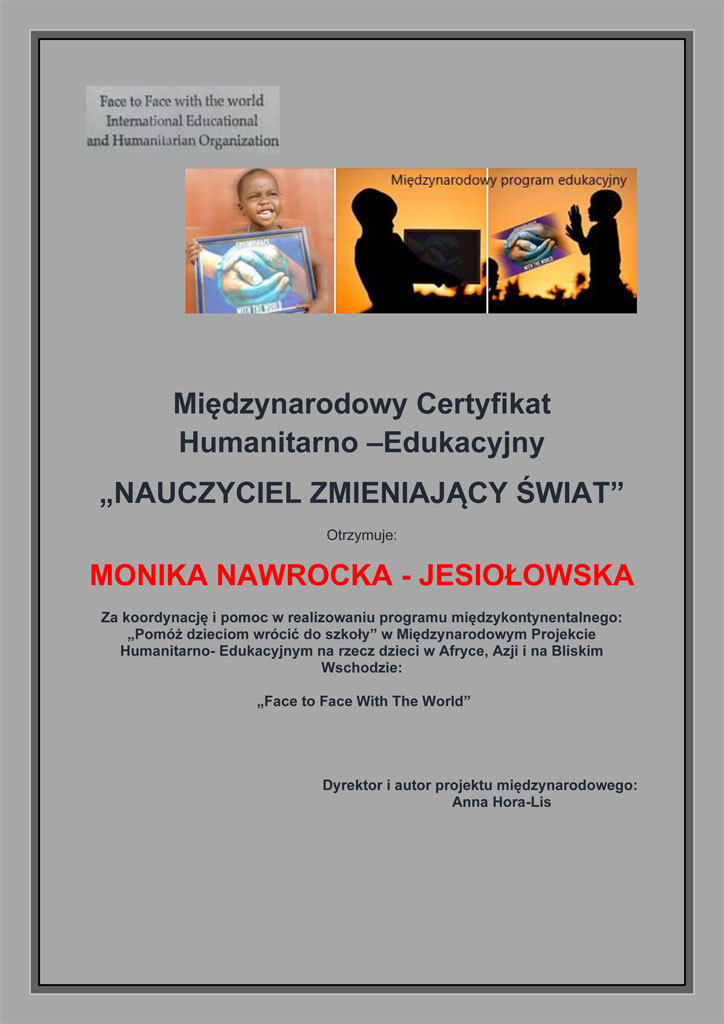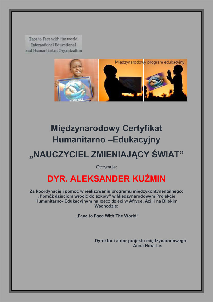 Dyrektor Pan Aleksander Kuźmin oraz nasza szkoła otrzymała certyfikat za udział w projekcie Face to Face with the World. Cieszymy się, że możemy brać