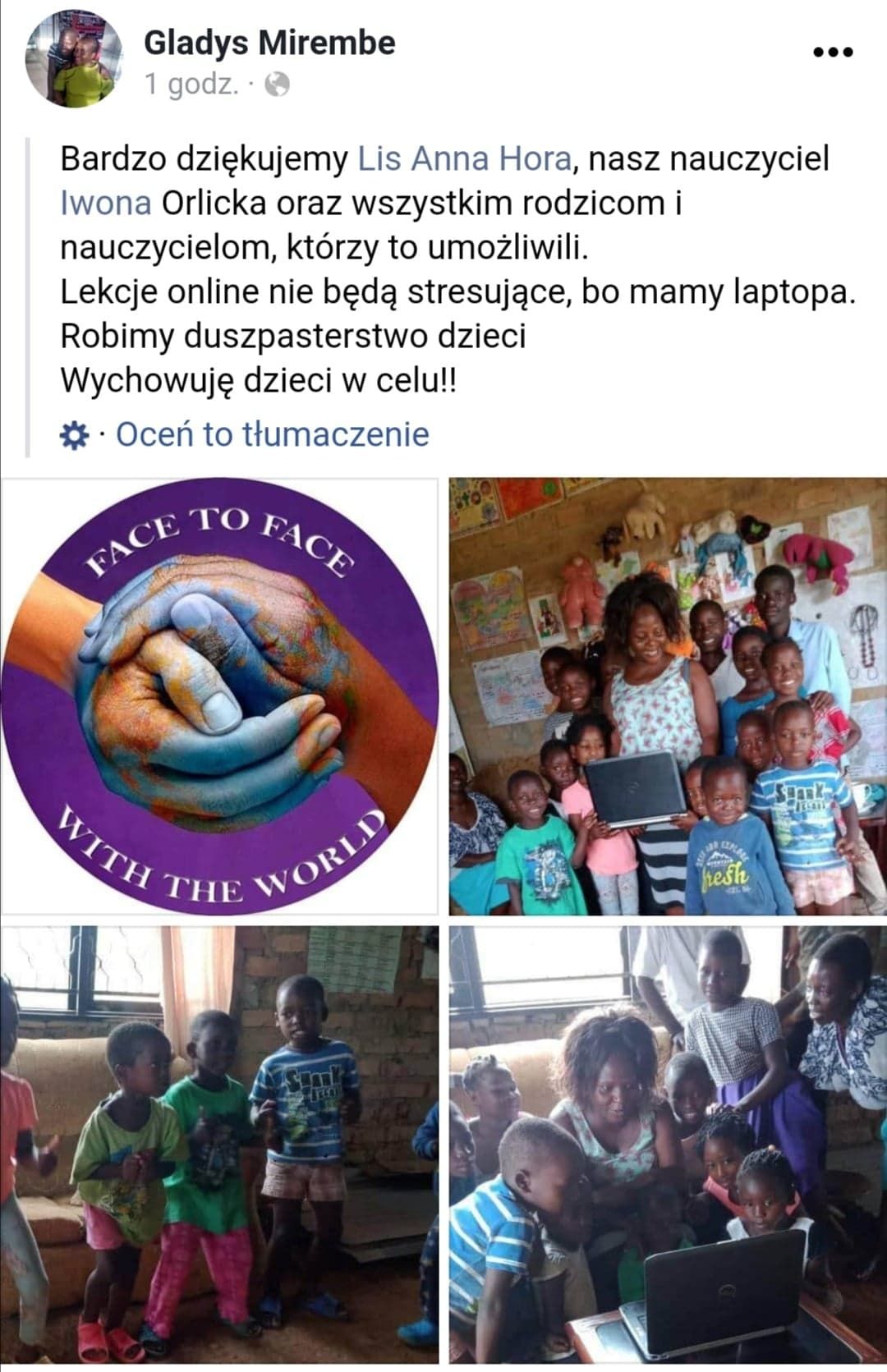 dzieci. Pani Anna Hora Lis odpisała, że na co dzień Face to Face pomaga finansowo biednym dzieciom i zapewniła, że wszelkie pieniądze