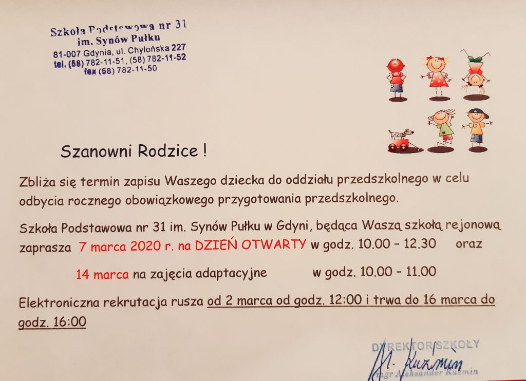 W związku ze specyficzną sytuacją i zagrożeniem epidemiologicznym oraz zaleceniami Ministerstwa Zdrowia Dzień Otwarty naszej szkoły zaplanowany na dzień 7 marca zostaje odwołany i prawdopodobnie odbędzie się w innym terminie. Zajęcia adaptacyjne dla grup zerowych również odbędą się w innym terminie. Za utrudnienia przepraszamy.