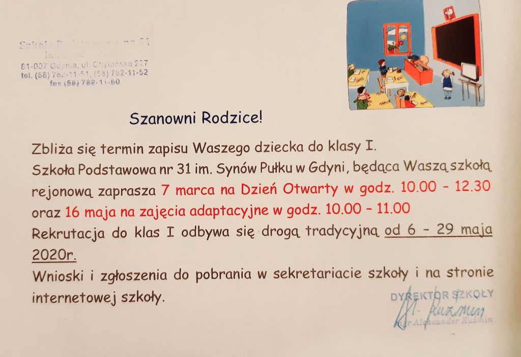 o przyjęcie dzieci do szkoły - na kopercie proszę umieścić tytuł: WNIOSEK/ZGŁOSZENIE DO KLASY ....... (napisać do której klasy).