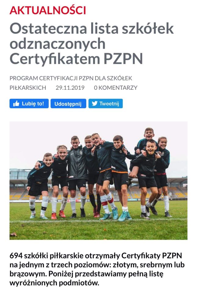 Z wielką przyjemnością informujemy, że Komisja Weryfikacyjna ds. Certyfikacji PZPN dla szkółek piłkarskich przyznała Państwu certyfikat