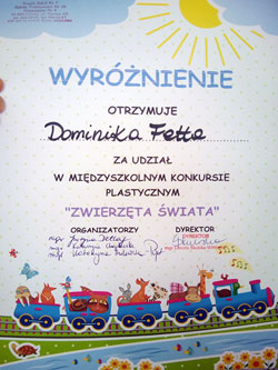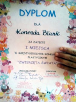 Miło nam poinformować, że w konkursie zorganizowanym przez SP nr 12 w Gdyni "Zwierzęta świata" Konrad Błank zajął I miejsce, Dominika Fetta otrzymała wyróżnienie.