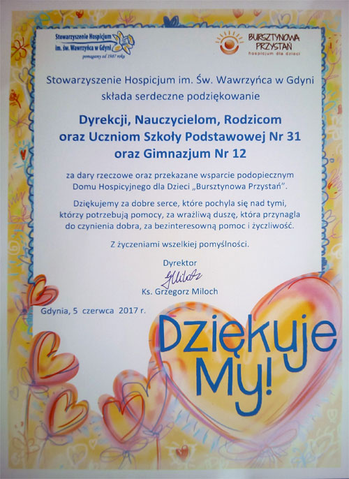Stowarzyszenie Hospicjum im. Św. Wawrzyńca w Gdyni składa serdeczne podziękowaniem Wszystkim zaangażowanym w akcję pomocy dla chorych dzieci z hospicjum "Bursztynowa Przystań"