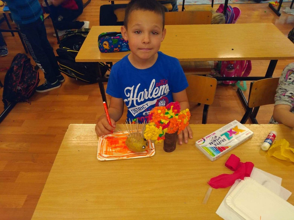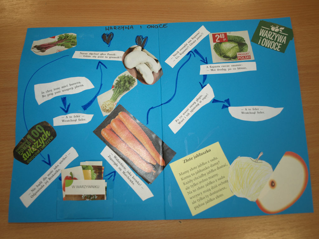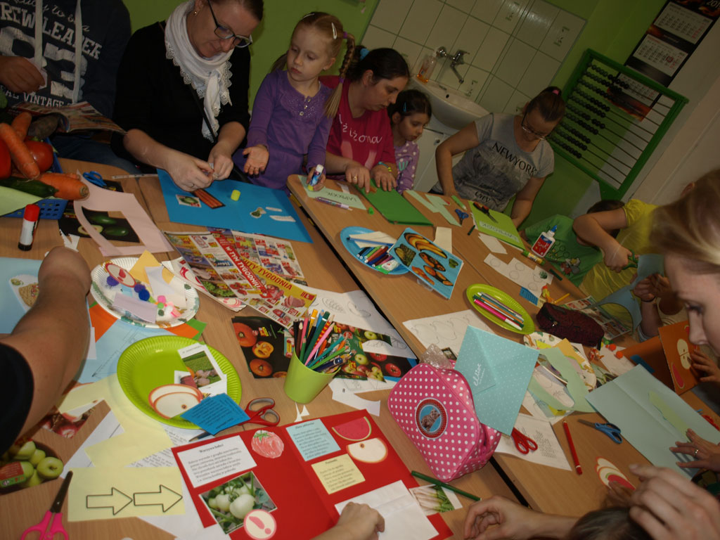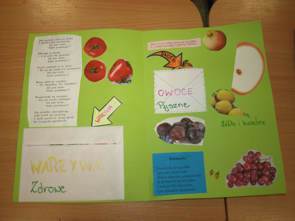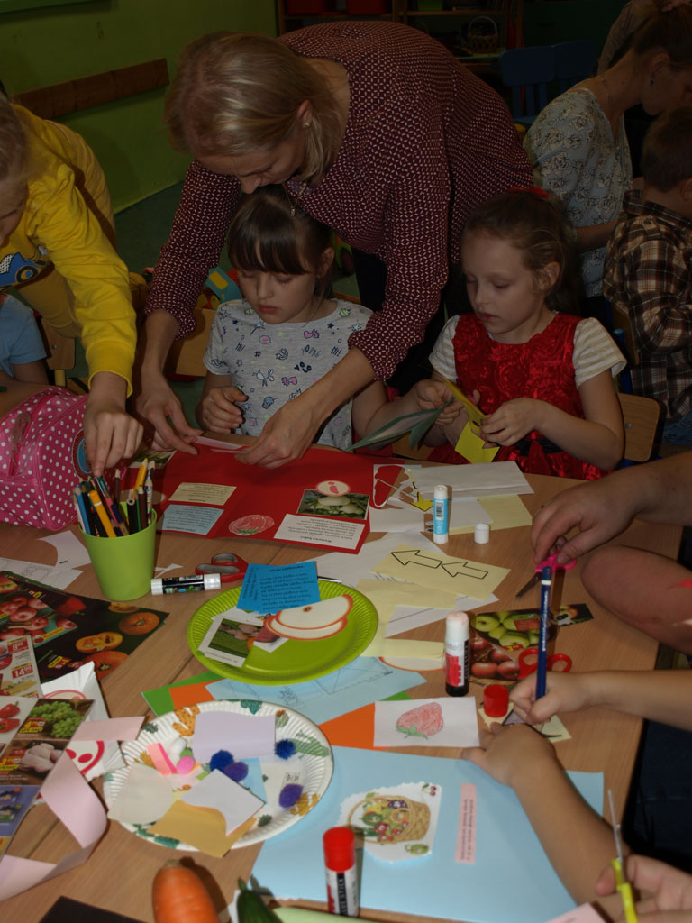 Dzieci z klasy Ia zaprosiły swoich najbliższych na jesienne popołudnie, podczas którego wykonywały kolorowe owocowo-warzywne lapbooki.