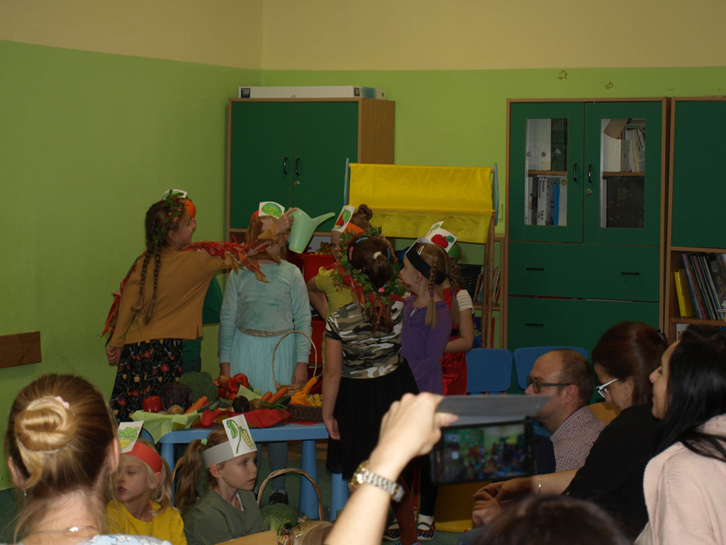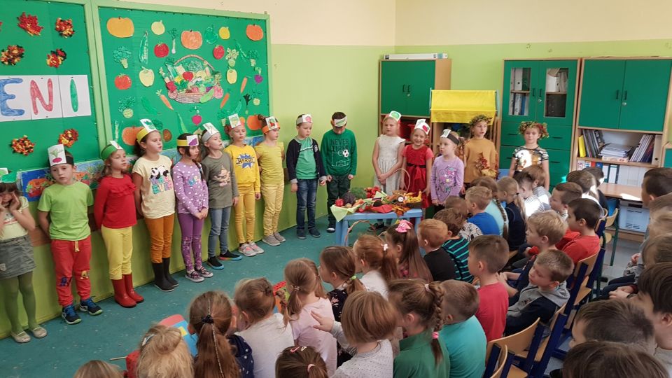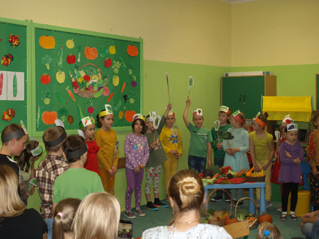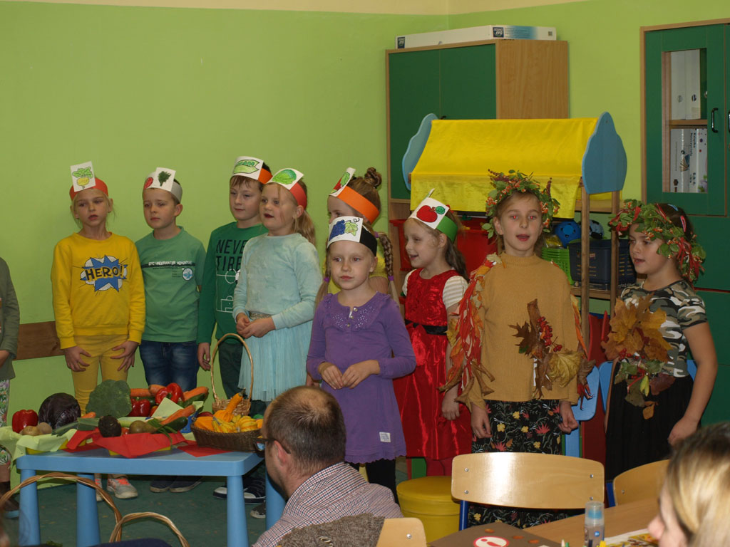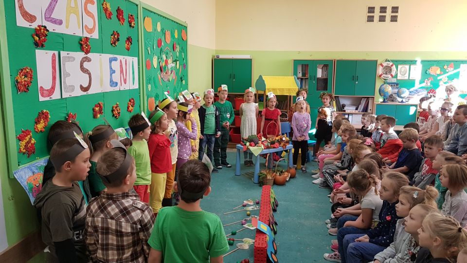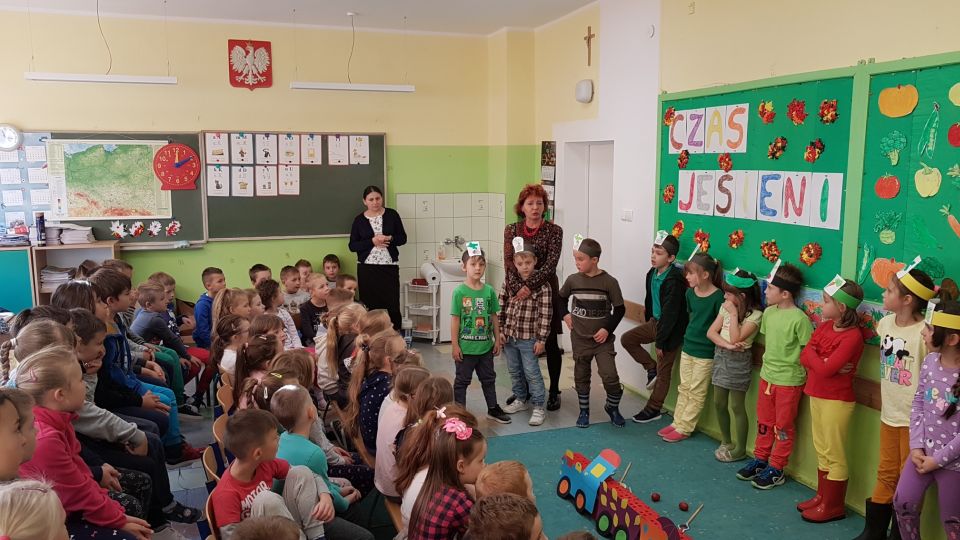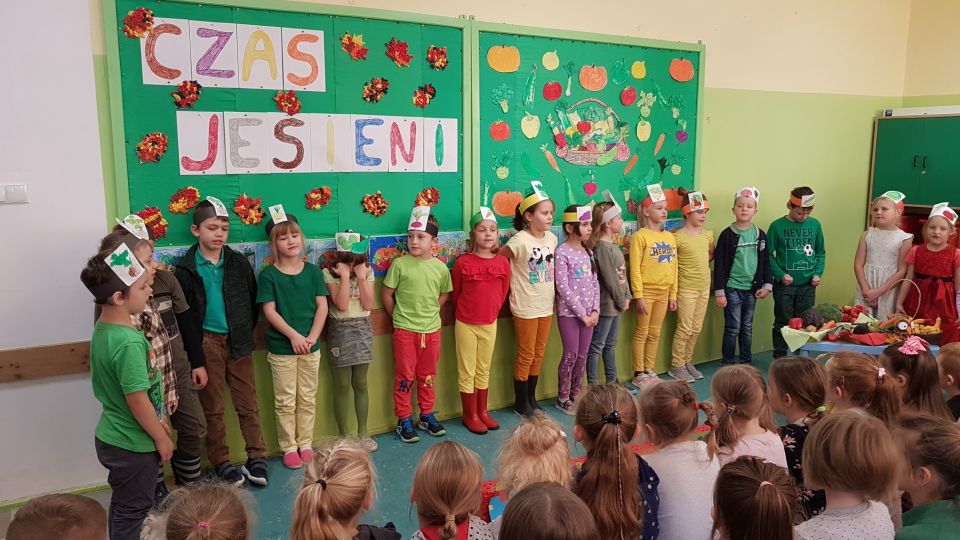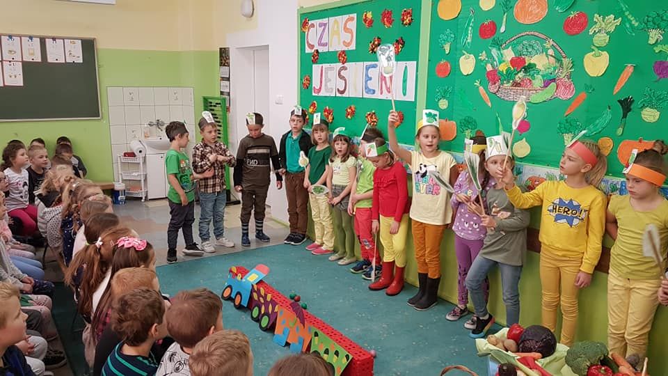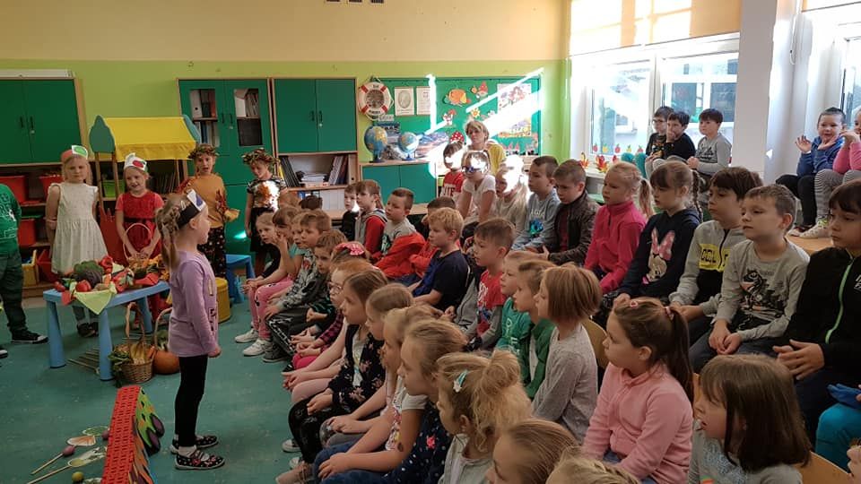 Barwne jesienne przedstawienie przygotowane przez klasę 1a obejrzały dziś dzieci klas młodszych oraz dzieci z zaprzyjaźnionych przedszkoli,