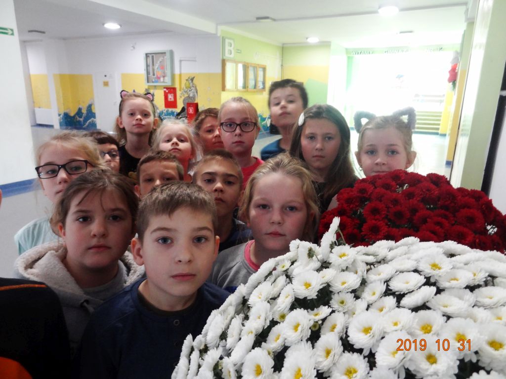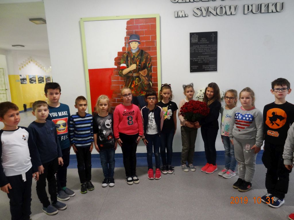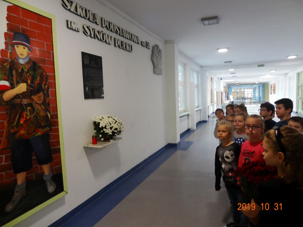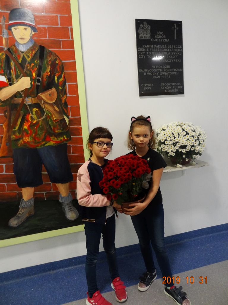 W czwartek 31 X uczniowie klasy 2 b złożyli kwiaty pod tablicą pamiątkową poświęconą najmłodszym żołnierzom,