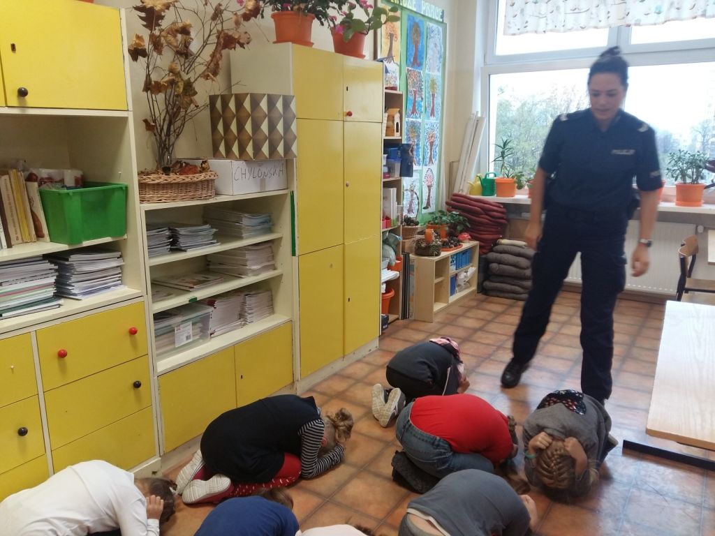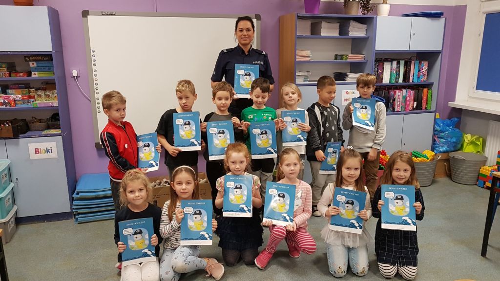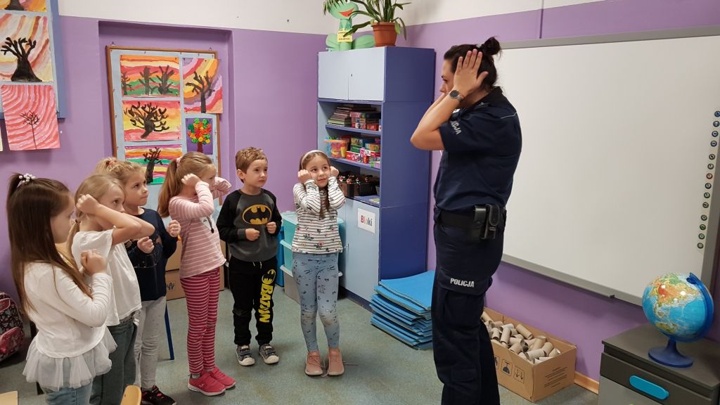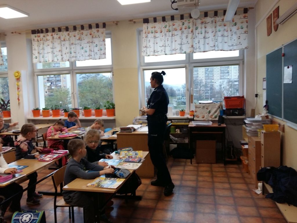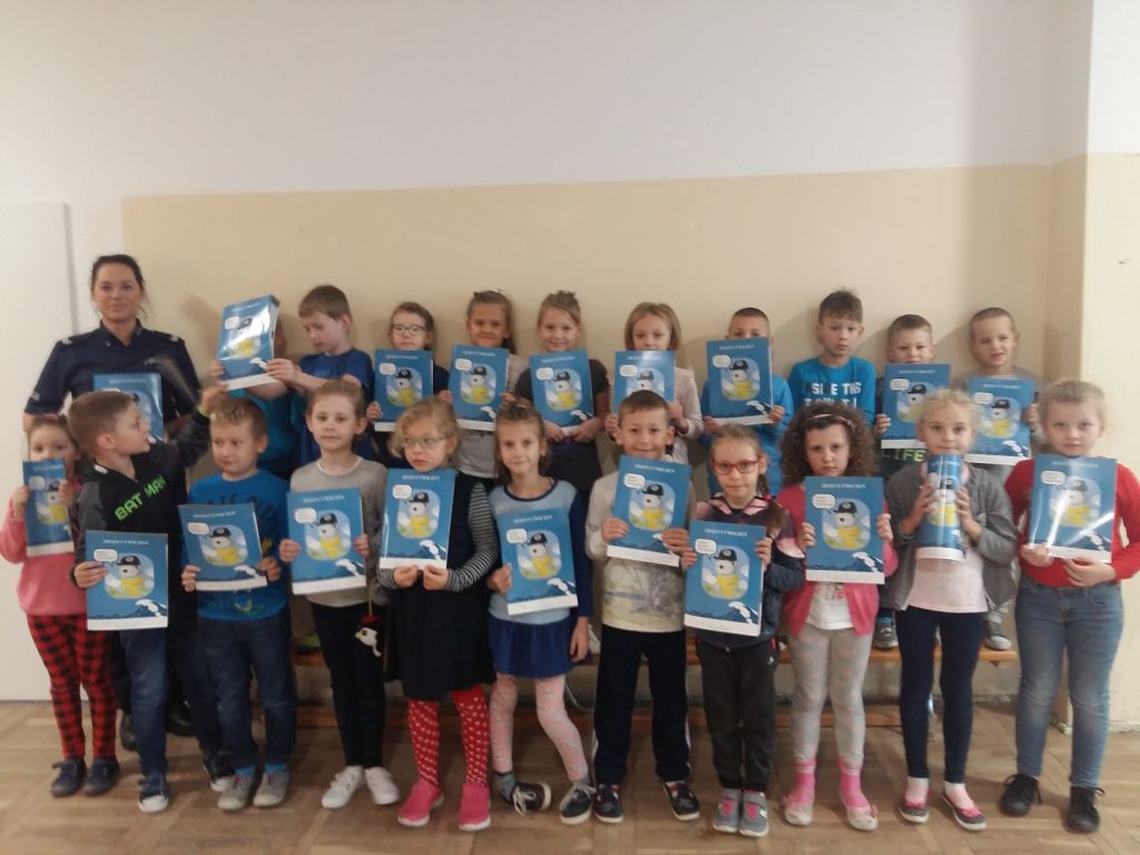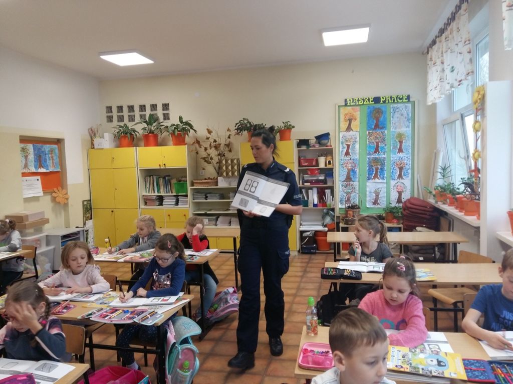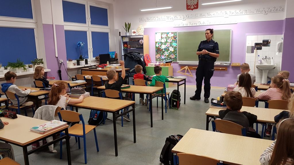 Spotkanie klas pierwszych z policjantką w ramach programu "Policyjna foczka uczy zasad bezpieczeństwa".