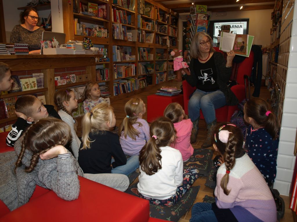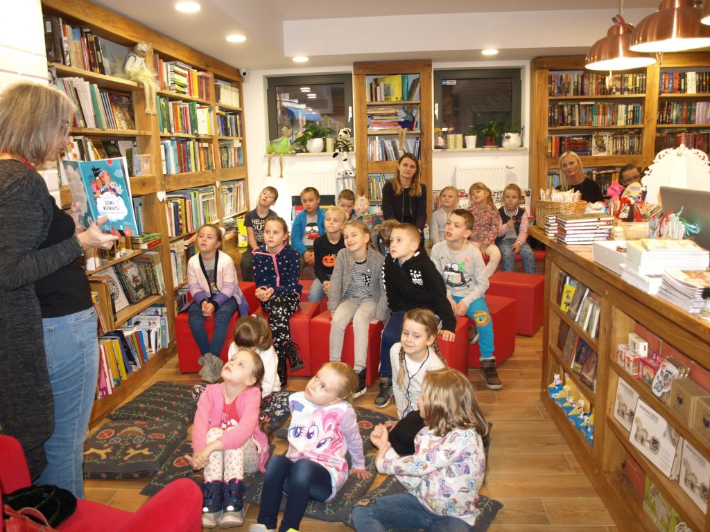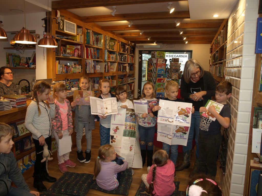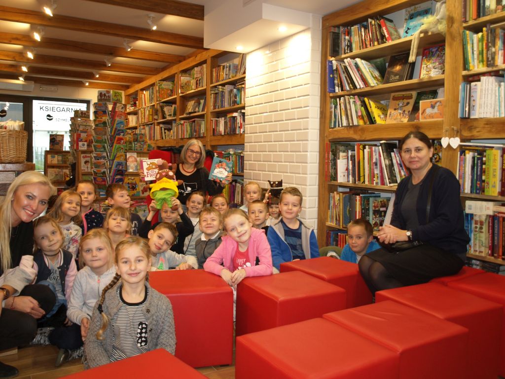 We wtorek 12 listopada klasa Ia odwiedziła pełną uroku i pachnącą książkami księgarnię Szymelka, mieszczącą się w centrum Gdyni. Dzieci zostały zaproszone na spotkanie z pisarką, Panią Roksaną Jędrzejewską-Wróbel, autorką wielu ciekawych książek dla dzieci. Pani Roksana opowiedziała dzieciom, w jaki sposób powstają książki, począwszy od pomysłu do gotowej książki w księgarni. Dzieci chętnie dzieliły się swoimi spostrzeżeniami, doświadczeniami i uważnie słuchały porad i wskazówek, jak zacząć pisać opowiadania i książki. Z uwagą wysłuchały także fragmentu książki Pani Roksany opowiadającej przygody ryjówki Florki. Na zakończenie dzieci otrzymały w prezencie książkę z dedykacją autorki. Bardzo dziękujemy Pani Ani z księgarni Szymelka za zaproszenie oraz Pani Roksanie za bardzo interesujące spotkanie w miłej atmosferze. Jednocześnie informujemy, iż w naszej szkolnej bibliotece znajdują się książki Pani Roksany Jędrzejewskiej-Wróbel, więc zachęcamy do czytania.
