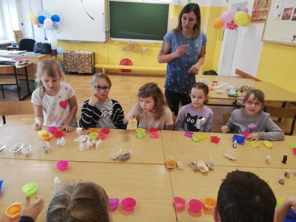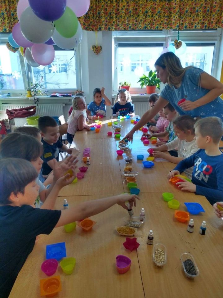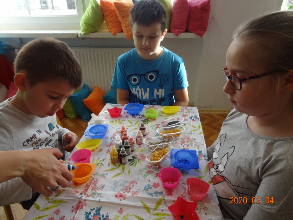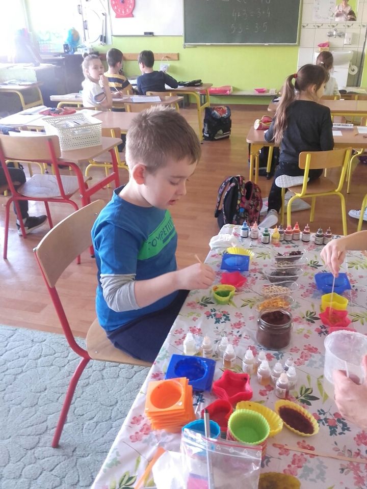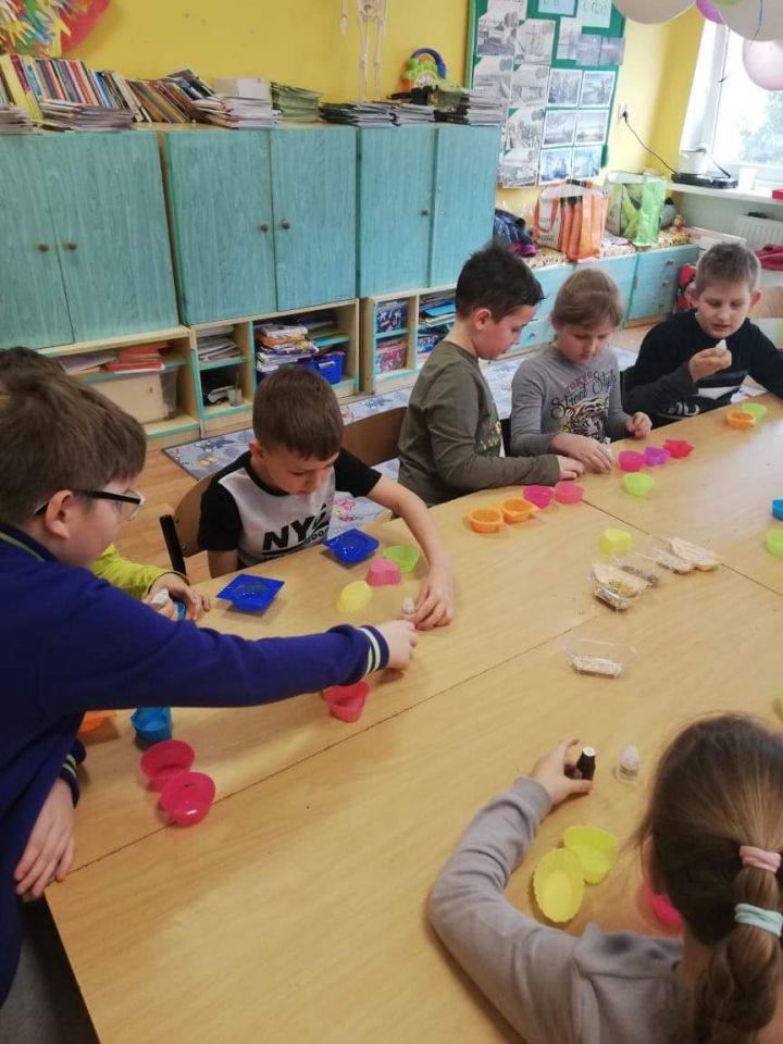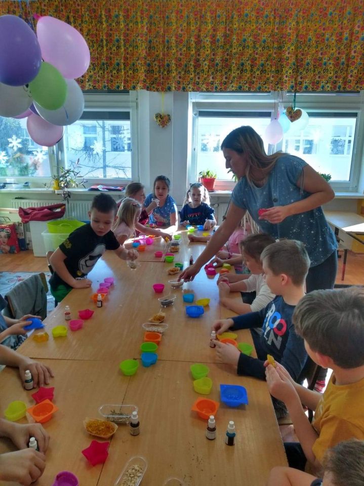 Uczniowie klasy 2 b wzięli udział w warsztatach mydlarskich. Dzieci same skomponowały i wykonały swoje mydełka. Dobrały kształt, kolor, zapach oraz zdrowe i ekologiczne dodatki. Zrobiły prześliczne, kolorowe, mieniące się, pachnące serduszka, gwiazdki, babeczki, pierniczki …