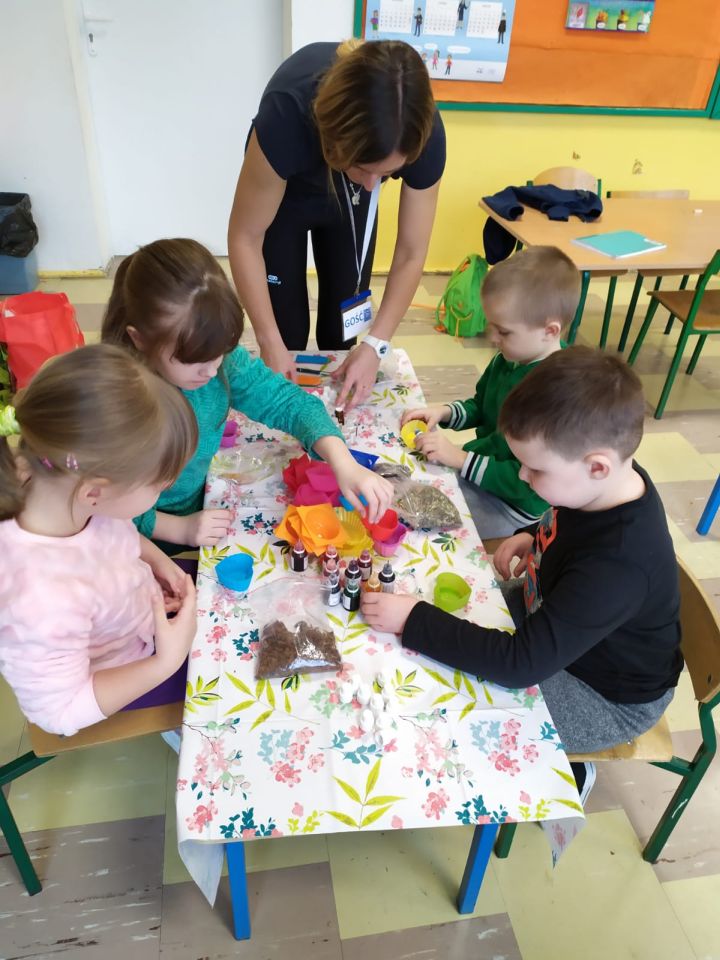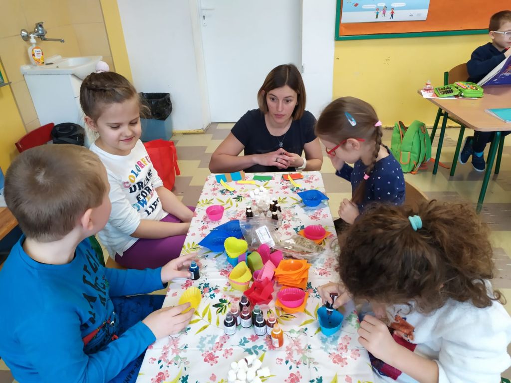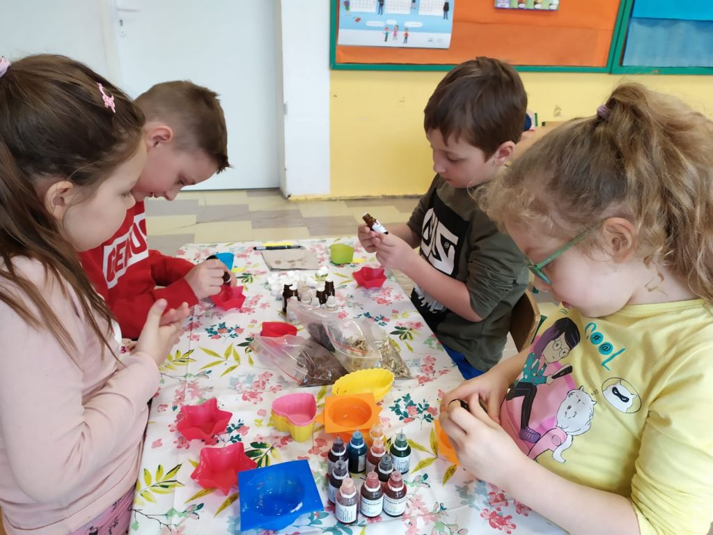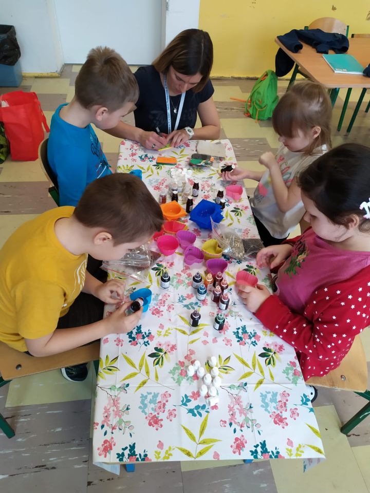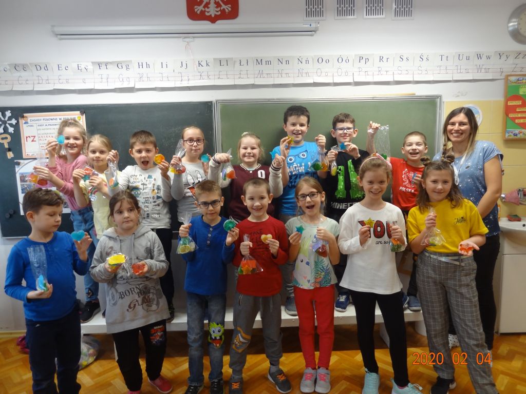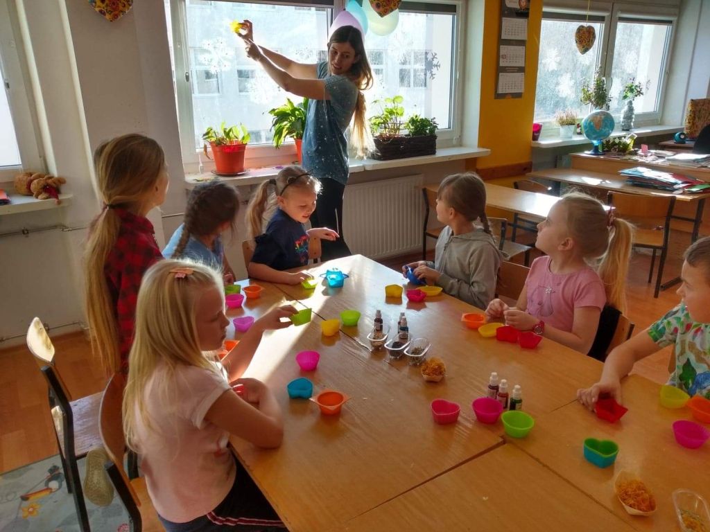 Uczniowie klasy 2 b wzięli udział w warsztatach mydlarskich. Dzieci same skomponowały i wykonały swoje mydełka. Dobrały kształt, kolor, zapach oraz zdrowe i ekologiczne dodatki. Zrobiły prześliczne, kolorowe, mieniące się, pachnące serduszka, gwiazdki, babeczki, pierniczki …