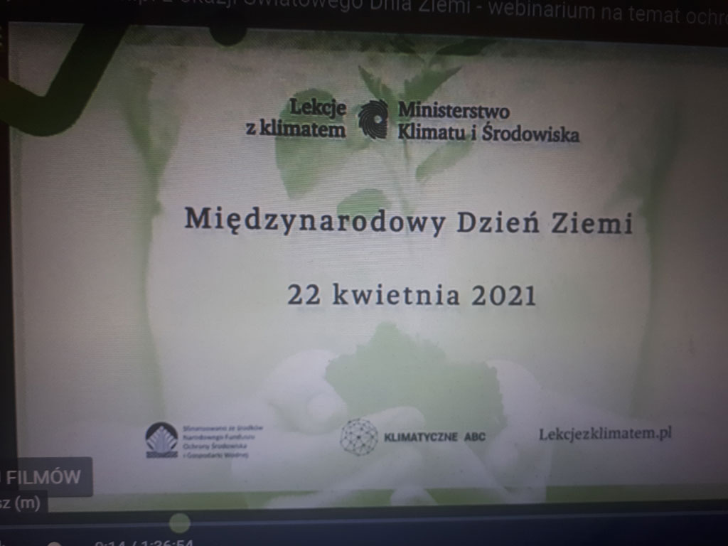 W dniu 22 kwietnia w ramach Międzynarodowego Dnia Ziemi uczniowie klasy 7A wzięli udział w ogólnopolskiej lekcji geografii online, zorganizowanej pod patronatem Ministerstwa Klimatu i Środowiska. W trakcie spotkania poruszane były kwestie związane z globalnym ociepleniem klimatu na świecie, działalnością człowieka, emisją do atmosfery szkodliwych gazów i pyłów, zanieczyszczeniami środowiska, ich skutkami oraz sposobami poprawy stanu Naszej Planety Ziemi.