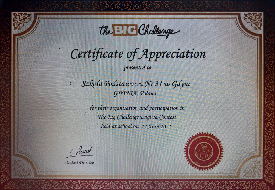Niedawno przyszły wyniki międzynarodowego konkursu z języka angielskiego The Big Challenge. Uczniowie otrzymali certyfikaty ze szczegółowymi danymi swych osiągnięć i ogromne