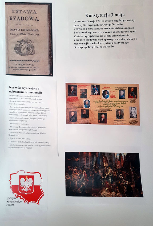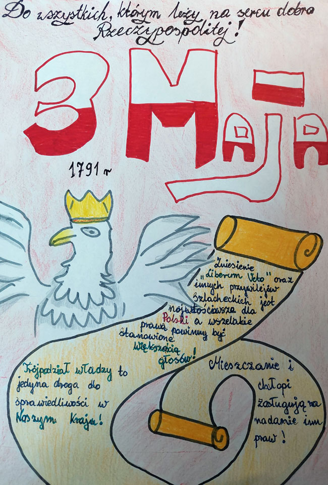 W związku z przypadającą w tym roku 230 rocznicą uchwalenia Konstytucji 3 Maja w naszej szkole odbył się z tej okazji konkurs historyczny. Zadaniem uczestników było stworzenie