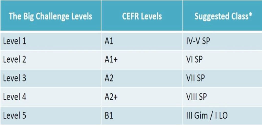 Konkurs proponuje łącznie 5 poziomów trudności, poziomy The Big Challenge odpowiadają poziomom A1-B1 przyjętym w Europejskim Systemie Opisu Kształcenia Językowego (ang. CEFR). Dla każdego poziomu