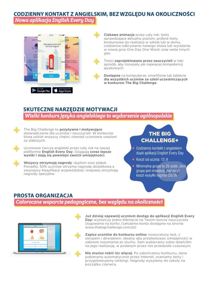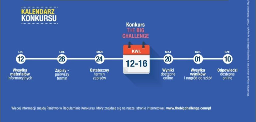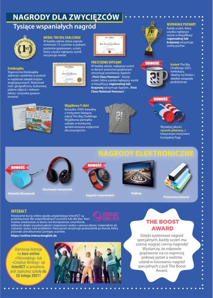 – Nagrody indywidualne dla uczniów: każdy uczestnik, niezależnie od uzyskanych wyników, otrzymuje dyplom THE BIG CHALLENGE oraz plakat.
