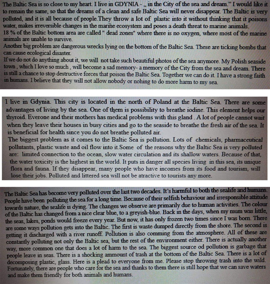 W Międzynarodowym konkursie "I live by the sea" wezmą udział: Franciszek Janeczko 6d, Stanisław Połetek 6d, Godbe Egwuatu 6d, Nikola Sobczak 8c, Michał Kamiński kl.5a. Konkurs wymagał napisania pracy na temat spraw dotyczących głównie Bałtyku, bo to nasz region, w liczbie maksimum 250 słów w języku angielskim oraz zrobienia zdjęcia bądź filmu w tej tematyce. Można było zrobić opis, opowiadanie, odezwę/apel. Cały opis konkursu jest we wcześniejszych wpisach na fb szkoły oraz na stronie internetowej szkoły. Wyżej wymienieni uczniowie stawili czoła wymogom konkursu, a trzeba przyznać, że konkurs ten jest pewnym wyzwaniem i wymaga kreatywności oraz poprawności językowej, wyrażania swych myśli w języku angielskim. Poniżej prace konkursowe (bez zdjęć Bałtyku). Uczniowie mogli liczyć na pomoc nauczyciela przygotowującego ich do tego konkursu.