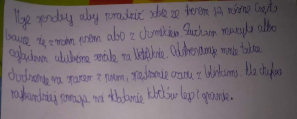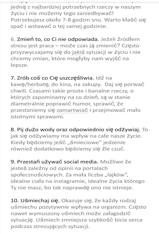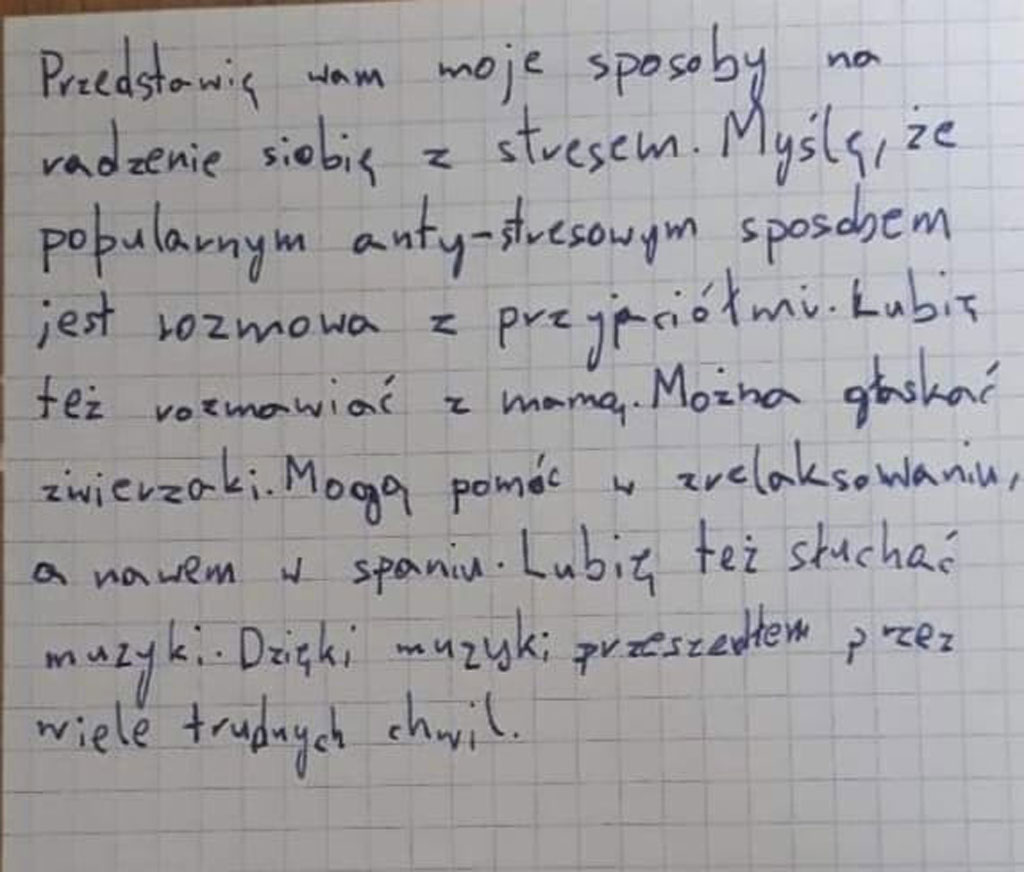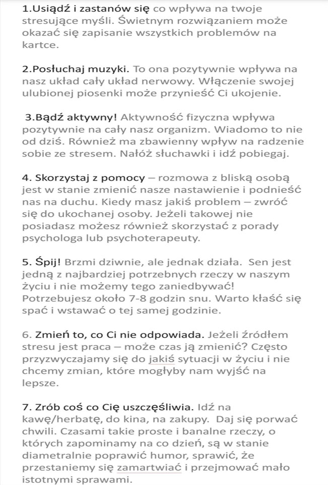 Na jednej z godzin wychowawczych klasa 6d podawała sposoby radzenia sobie ze stresem. Na zdjęciach przedstawiono niektóre z nich. Dziś na lekcji języka angielskiego jedna z grup klasy 6 d przedstawiła je Pani Gladys Mirembe i jej podopiecznym podczas zdalnej lekcji. Wspólnym "lekarstwem" na stres jest śpiew. Pani Gladys Mirembe ma piękny głos. Nagrała ostatnio piosenkę, którą wykonuje ze swymi biologicznymi dziećmi oraz dziećmi, którym pomaga.