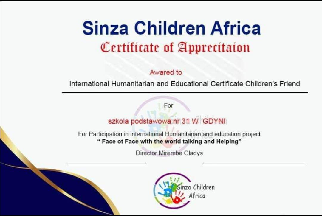 Certyfikat od Pani Gladys Mirembe dla SP 31 w Gdyni za udział w międzynarodowym projekcie - zarówno humanitarnym jak i edukacyjnym.