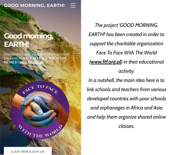 Nasza szkoła dołączyła do projektu Good morning, Earth. Jest to dalsza wspólpraca z Face to Face to the World.
