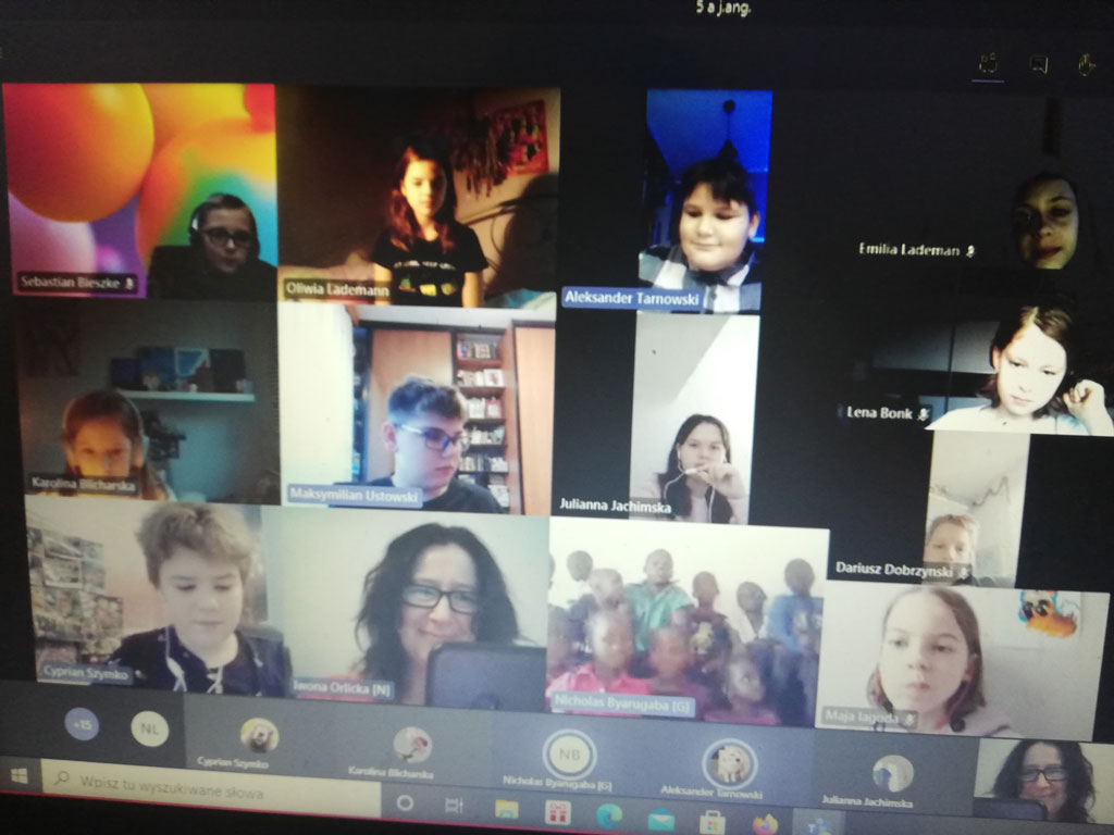 Dziś, 9 października 2020, odbyła się lekcja online z dziećmi z Ugandy. Wzięła w niej udział klasa 5a. Tematem lekcji były warzywa i owoce rosnące w Polsce. Uczniowie klasy 5a narysowali je i przedstawili kolegom i koleżankom z Afryki. Dzieci z Ugandy wraz z Panią Gladys Mirembe pokazały prawdziwe owoce i warzywa rosnące w ich kraju. Wspólne nam są pomidory, fasola, ale nie tylko. Podczas lekcji dzieci z Ugandy próbowały powiedzieć kilka zwrotów po polsku, a nasi uczniowie w Luganda. Język suahili jest językiem urzędowym. Dla naszych uczniów dziesiejsze spotkanie było pięknym nowym doświadczeniem.