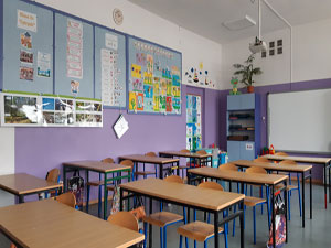Ławki w szkole puste, cicho, trochę smutno, dzwonek szkolny nie dzwoni...