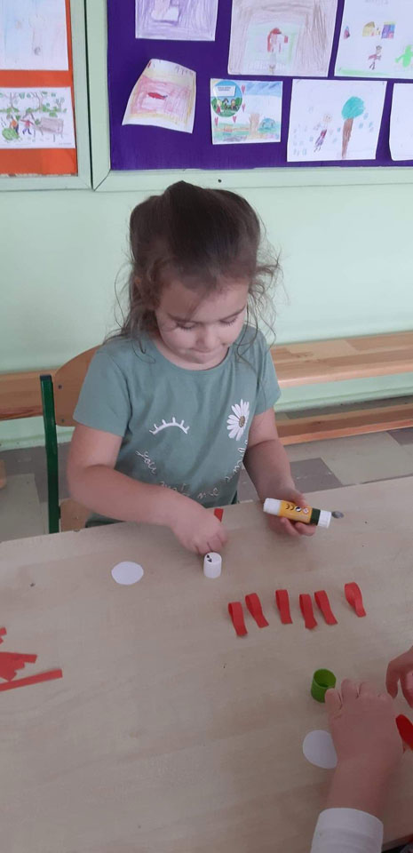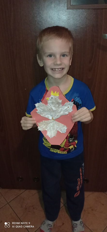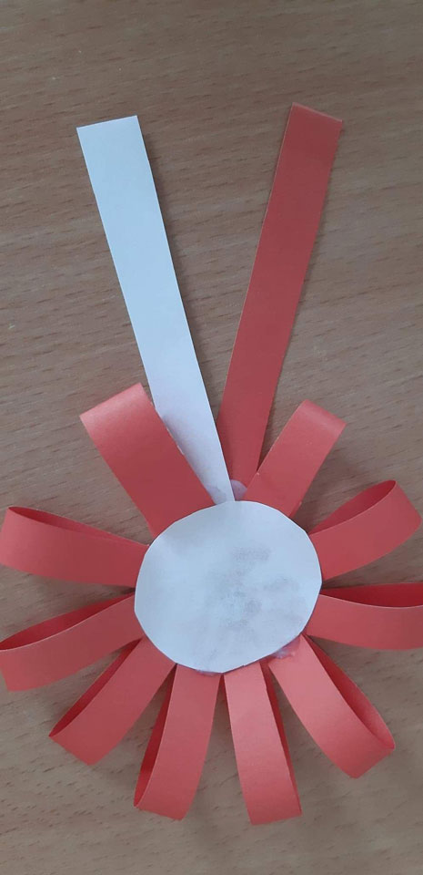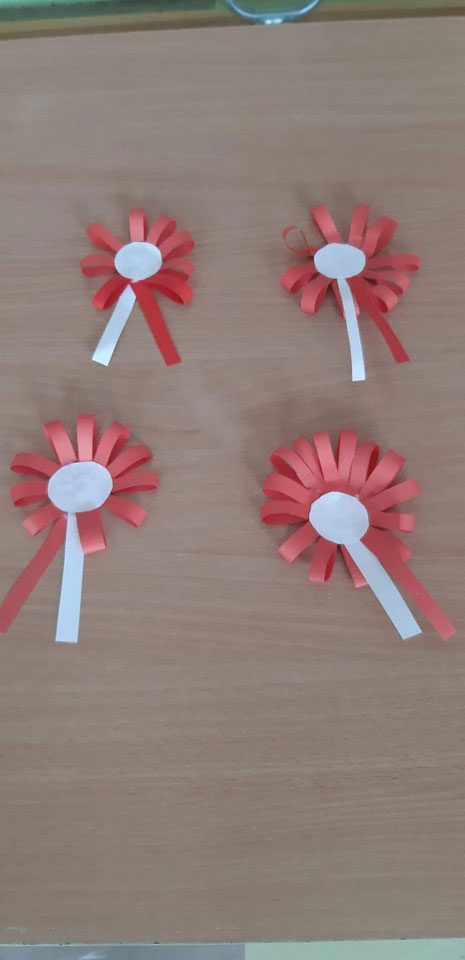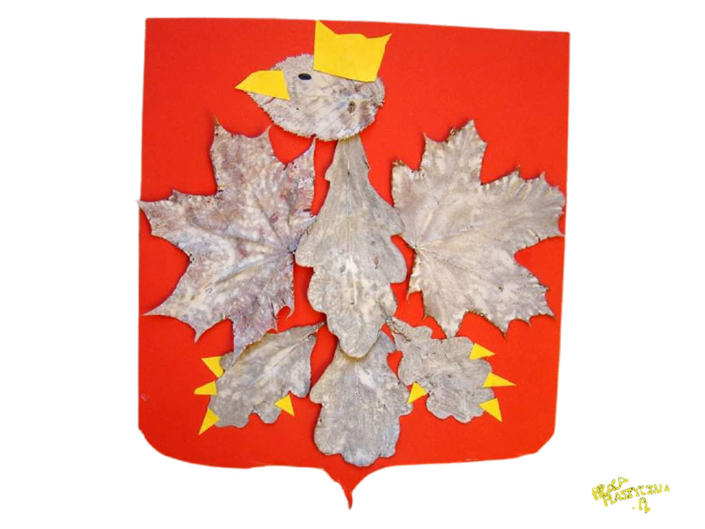 Z czerwonej kartki odcinamy dolną część na kształt tarczy godła. Dobieramy różne liście, układamy z nich orła, następnie malujemy na biało. Po wyschnięciu liście naklejamy na tarczę.