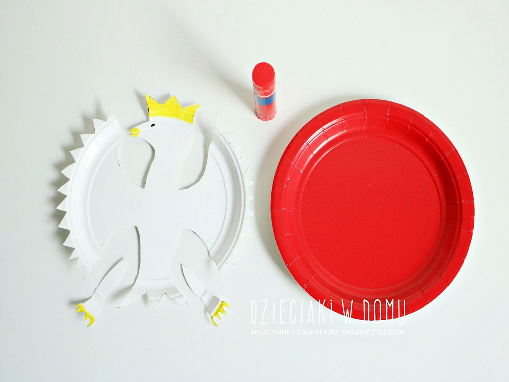 Na żółto kolorujemy koronę, dziób oraz szpony. Na koniec naklejamy orła na czerwone tło, czyli drugi talerzyk. Gotowe.