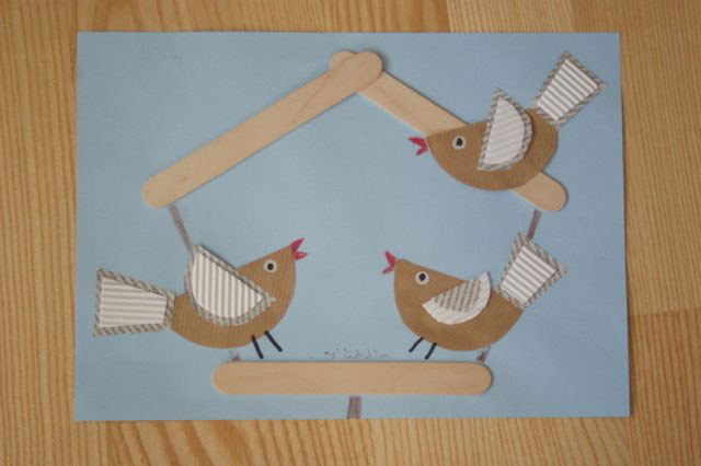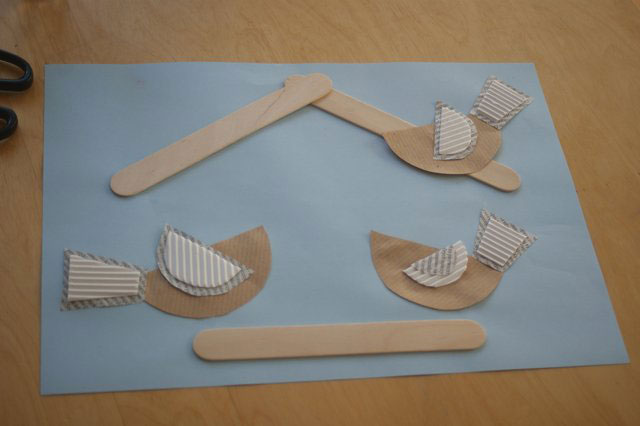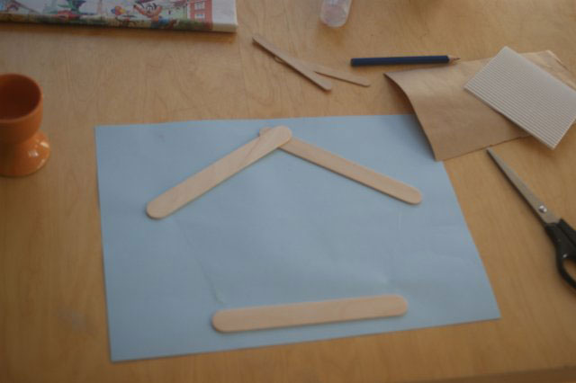 1. Na niebieskiej kartce przyklejamy patyczki kreatywne na kształt karmnika.