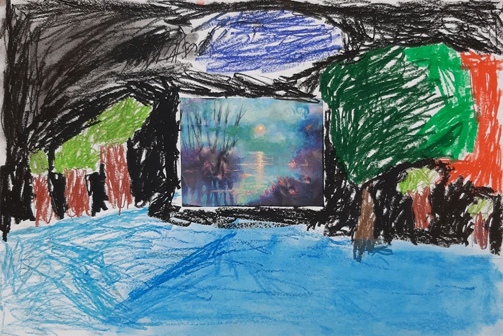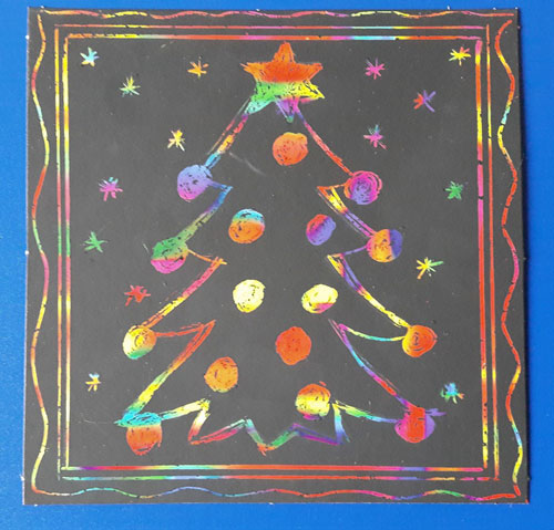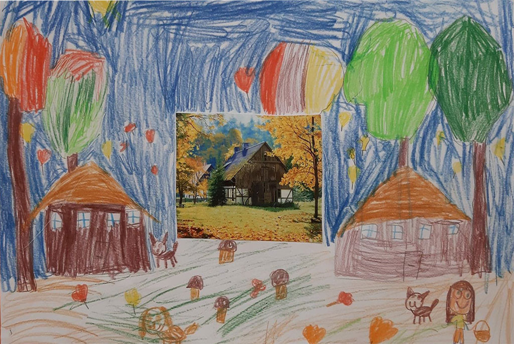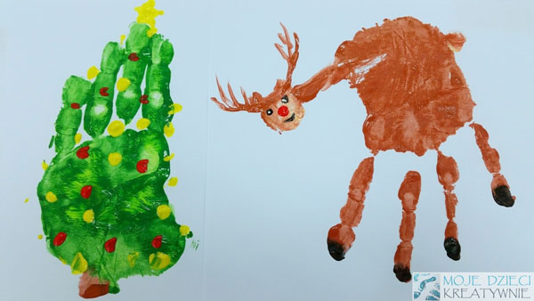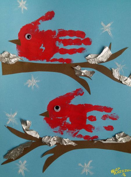 7. Na koniec można paluszkiem umoczonym w białej farbie domalować padający śnieg lub przykleić śniegowe gwiazdki wycięte dziurkaczem ozdobnym.