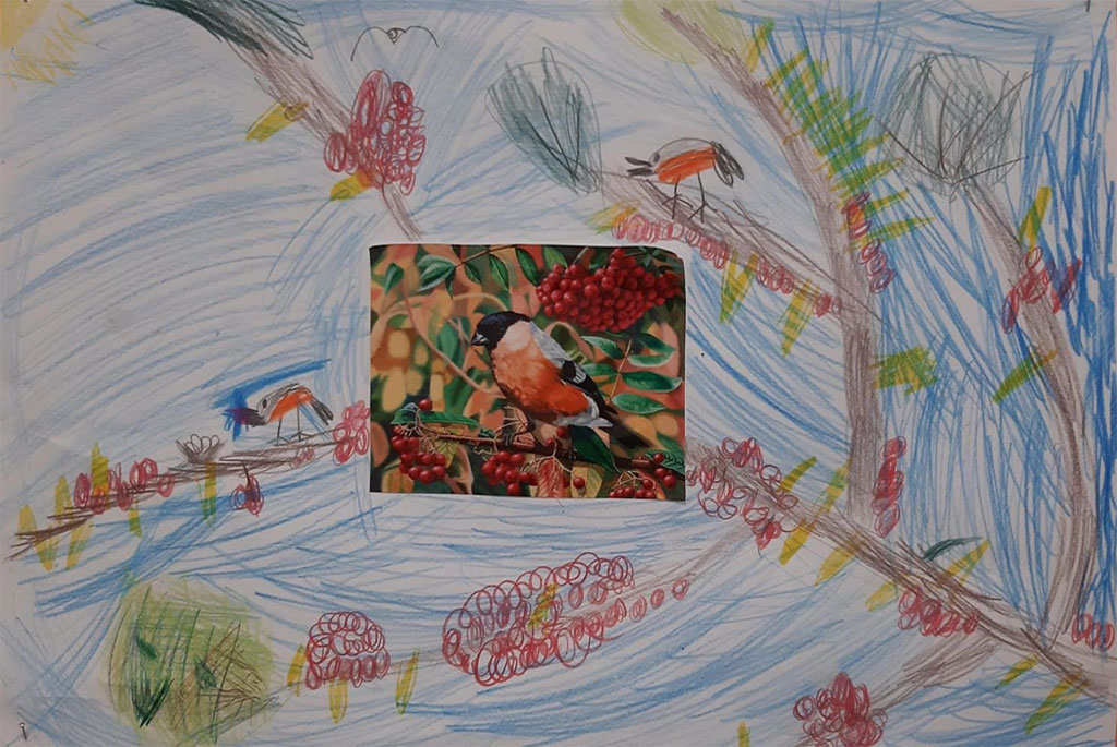 2. Wycinamy ptaki (wróble i sikorki) ozdabiamy papierem kolorowym lub plasteliną, piórkami.