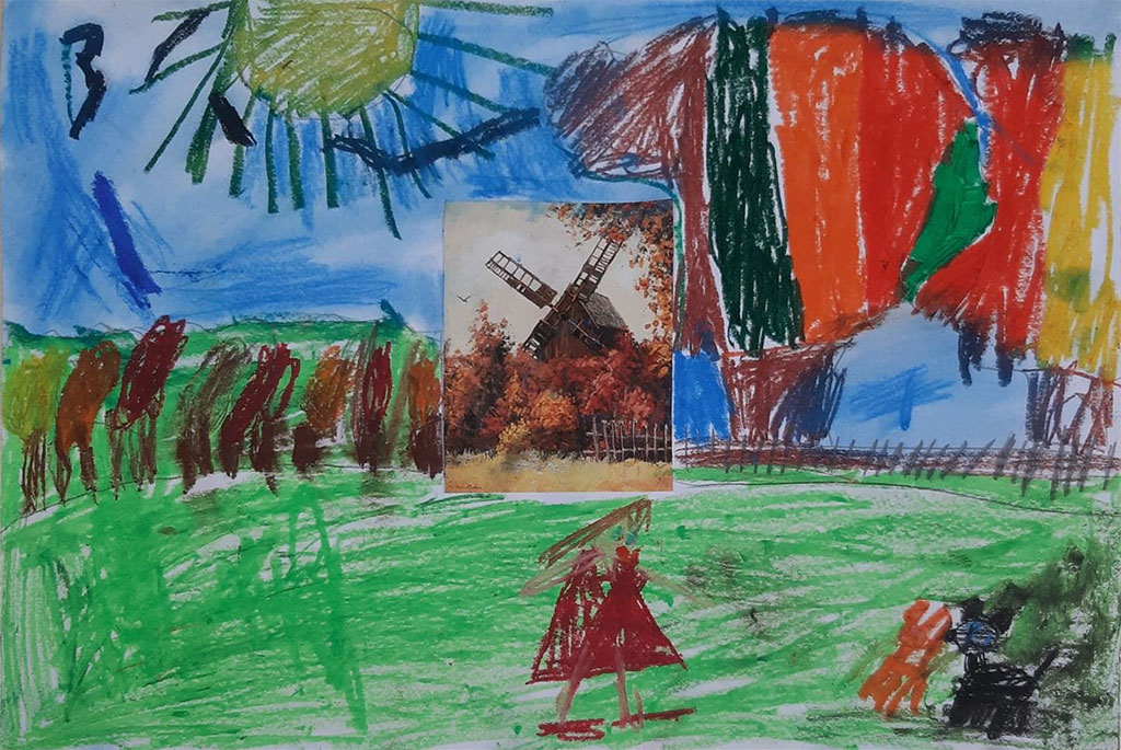 1. Z kolorowego papieru wycinamy karmnik, naklejamy na kartkę z bloku technicznego.