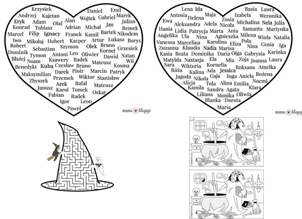 – w celu uniknięcia szkód, koniecznie zamieńcie ciężkie buty na kapcie), serce z imionami (Wycinamy dwa papierowe spore serca. Na jednym z nich wypisujemy popularne imiona żeńskie,