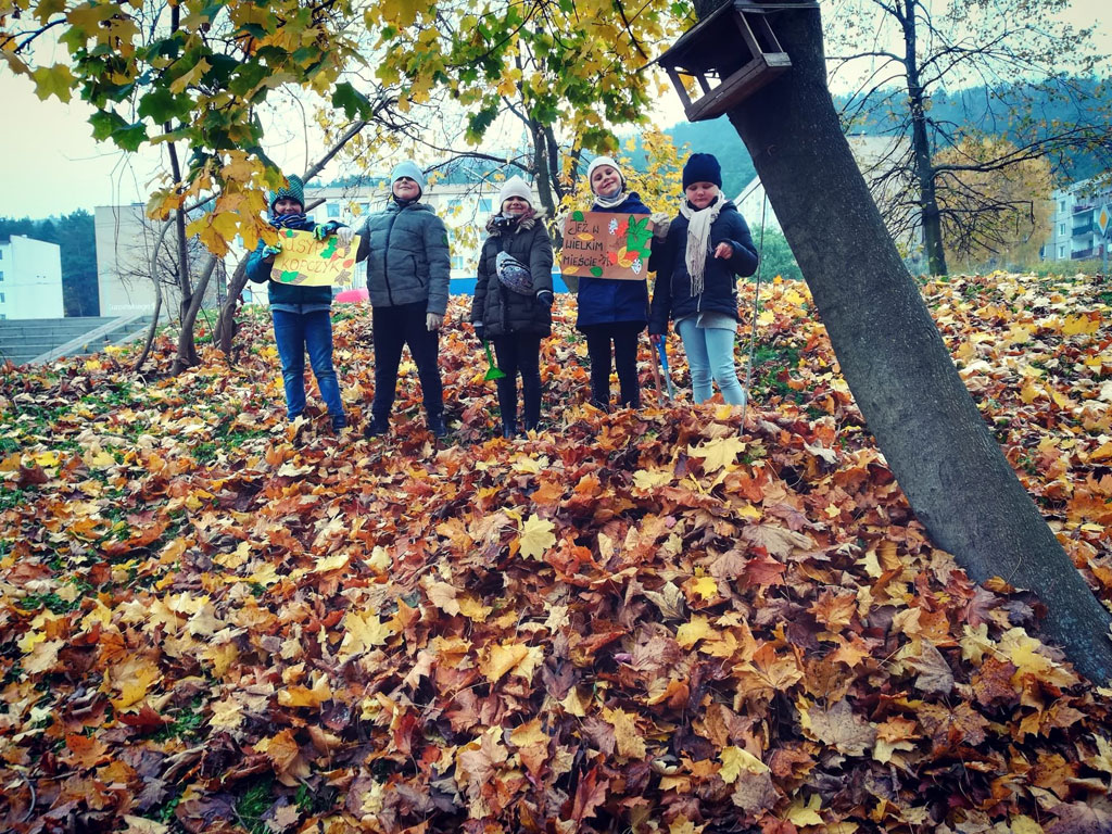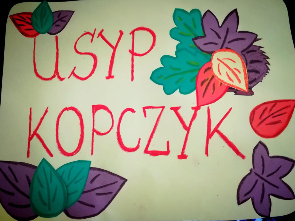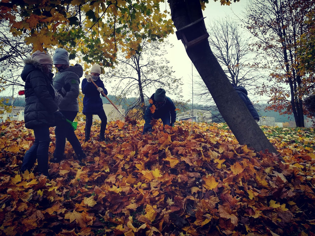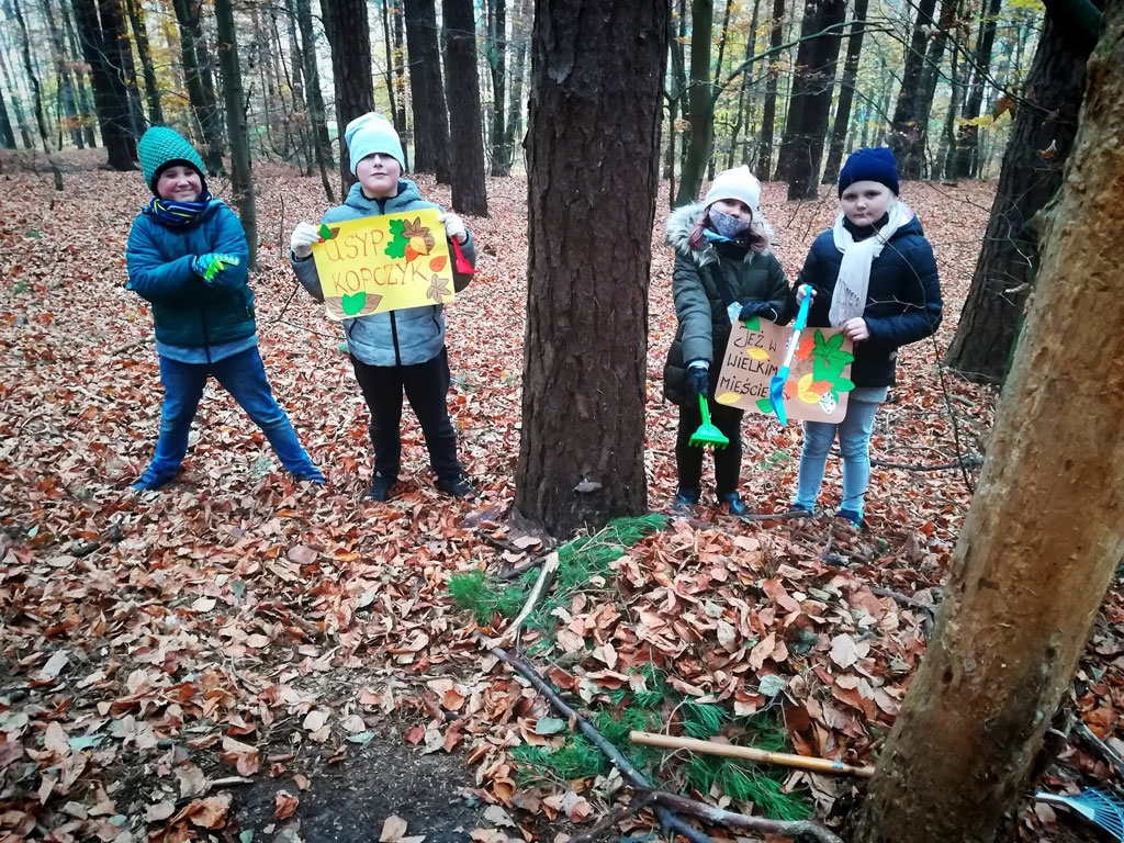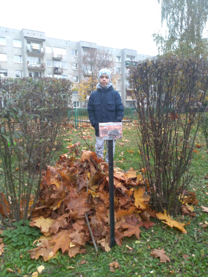 Klasa II A także włączyła się w akcję pomagającą jeżom przetrwać zimę. Dzieci dzielnie usypały kilkanaście kopczyków.
