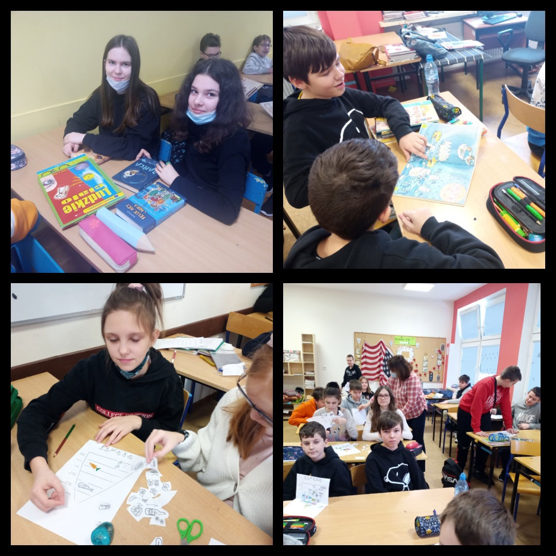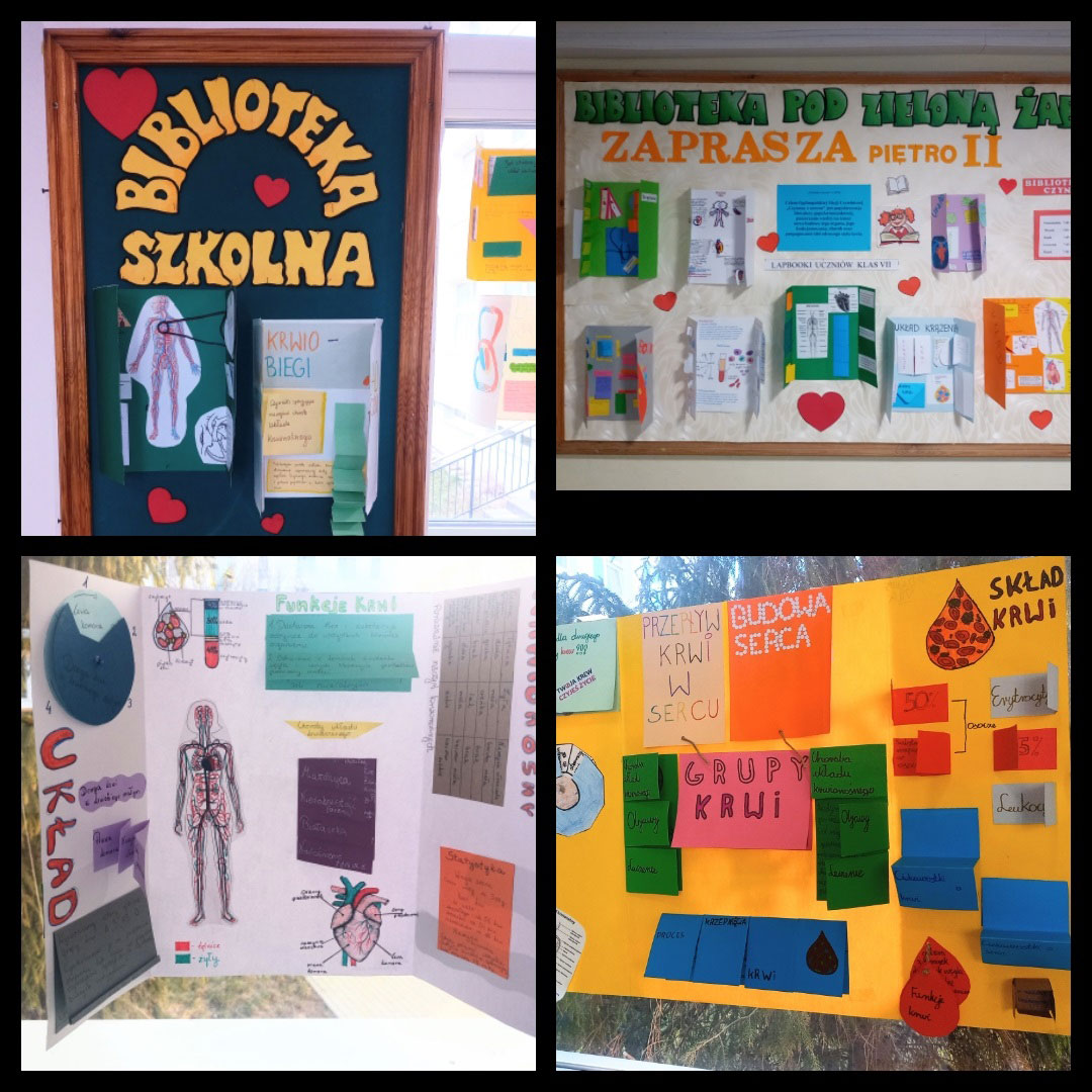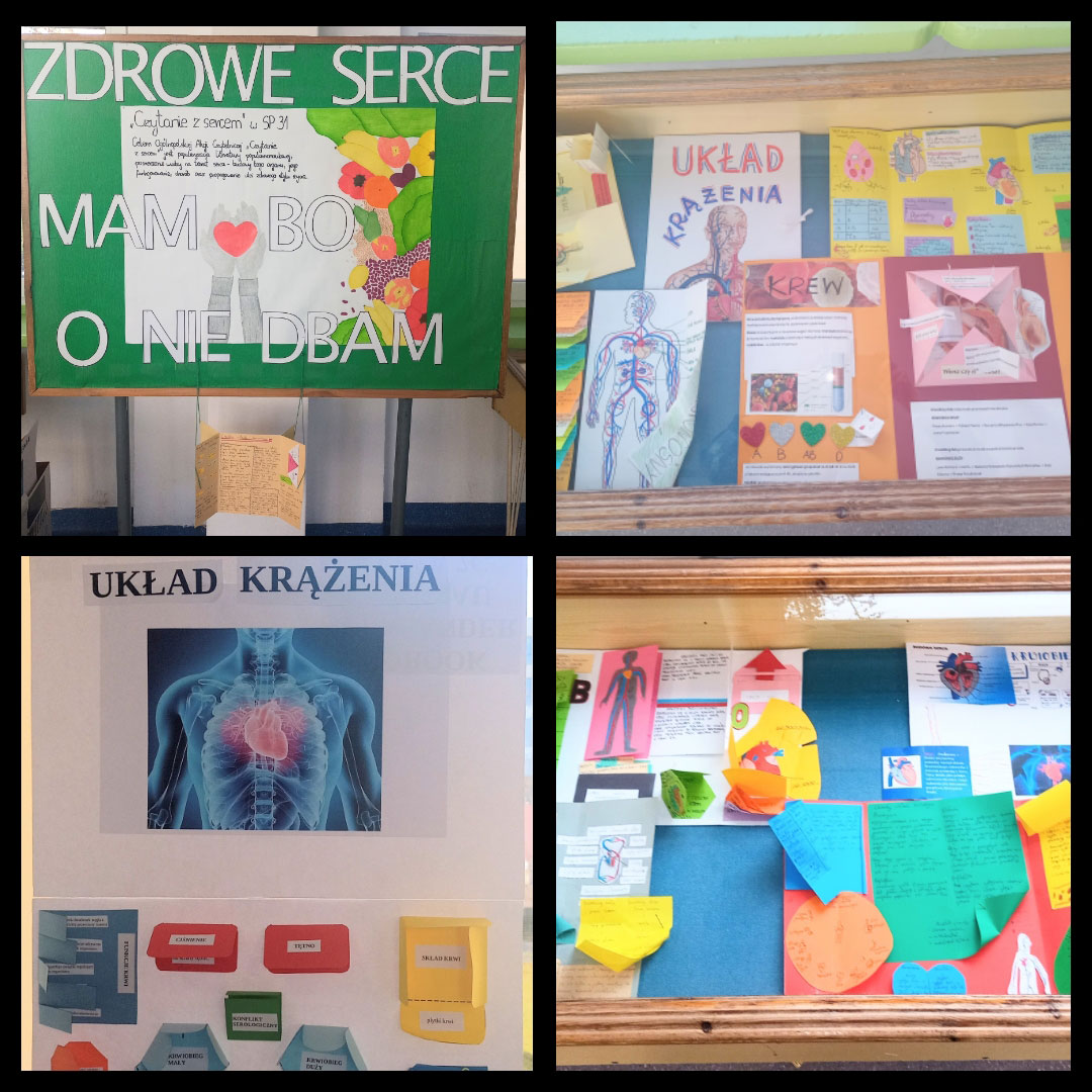 Następnie nauczyciel bibliotekarz przeprowadził lekcje biblioteczne w klasach IV i VII. W trakcie spotkania uczniowie wysłuchali tekstów i obejrzeli wiele publikacji podejmujących tematykę serca, co w rezultacie przyczyniło się do ożywienia dyskusji nt. zdrowego stylu życia. Poruszaliśmy zagadnienia takie jak: odżywianie, uprawianie sportu, umiejętność dobrego odpoczynku jako form przeciwdziałania chorobom układu sercowo-naczyniowego. Uczniowie odegrali scenki, rozwiązywali krzyżówki, zaproponowali hasło przewodnie wystaw bibliotecznych „Zdrowe serce mam, bo o nie dbam".