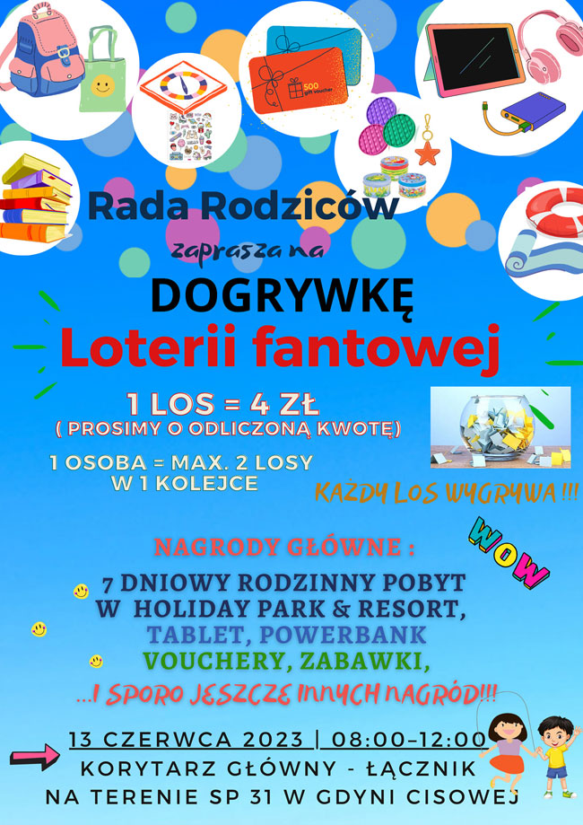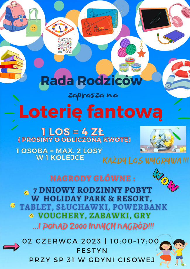 Dnia 2 czerwca w godzinach 10-17 na terenie naszej Szkoły odbędzie się Festyn, na którym jedną z atrakcji będzie Loteria Rady Rodziców.