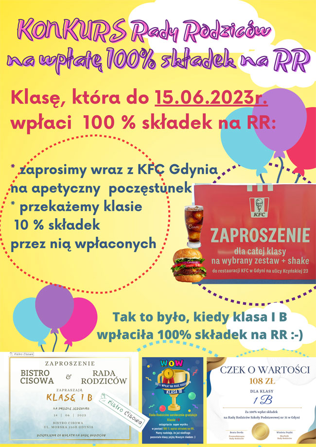 Dzięki Nim Rada Rodziców wręczyła uczniom mega wielkie zaproszenie ufundowane przez sponsora do restauracji KFC.