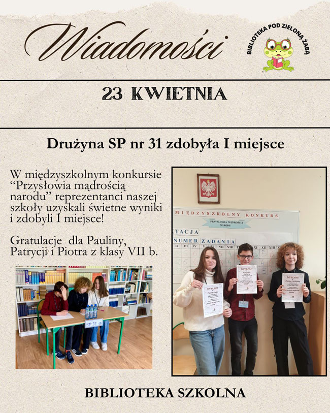 Paulina C., Patrycja E. i Piotr M. z klasy VII b zajęli I miejsce w Międzyszkolnym Konkursie: "Przysłowia mądrością narodu".