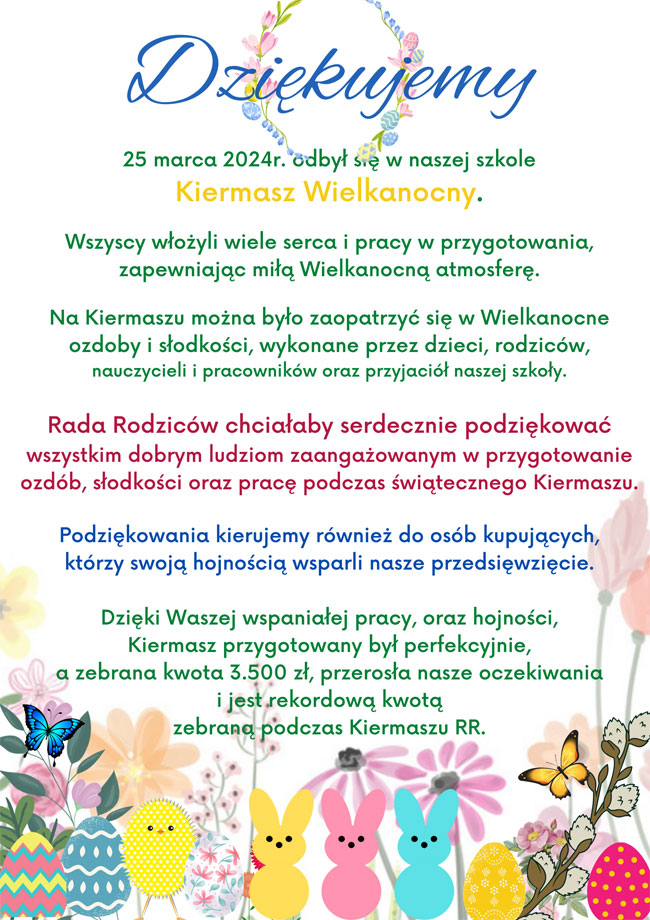 Rada Rodziców składa serdeczne podziękowania wszystkim Państwu, którzy wsparli Kiermasz Rady Rodziców czy to poprzez zrobienie przepięknych,