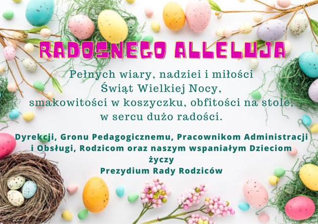 W tym wyjątkowym Wielkanocnym czasie chcielibyśmy Państwu życzyć małego zatrzymania w pędzie życia, ciepłych, radosnych chwil z bliskimi, wiary, nadziei i miłości. Niech nie zabraknie wśród nas dobra, niech obfitości goszczą na naszych stołach i w sercach, niech zajączek Wielkanocny dopisze i spisze się ;-), a kubełek wody przyniesie powodzenie we wszystkim, wszystkim Państwu, Waszym Rodzinom życzy Prezydium Rady Rodziców. Radosnego Alleluja!