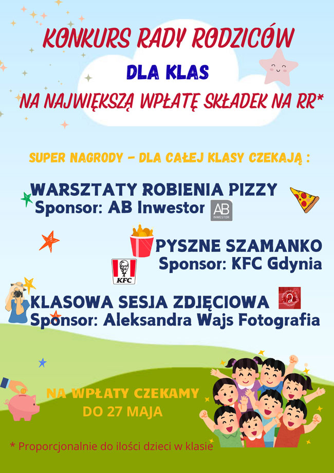 Rada Rodziców z przyjemnością informuje, że Zwycięzcami w Konkursie RR dla klas z najwyższymi wpłatami składek na RR są klasy: 2 B, 2 D, 1 B.