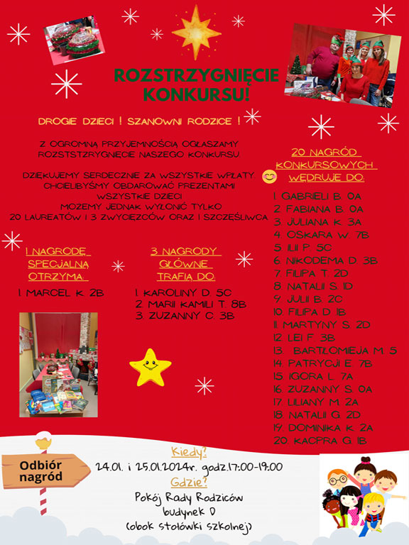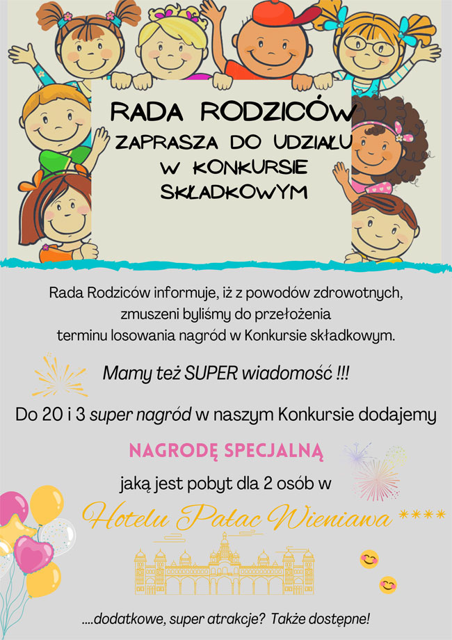 Rada Rodziców informuje, że losowanie nagród w Konkursie Rady Rodziców, z przyczyn zdrowotnych, musiało zostać przełożone na styczeń.