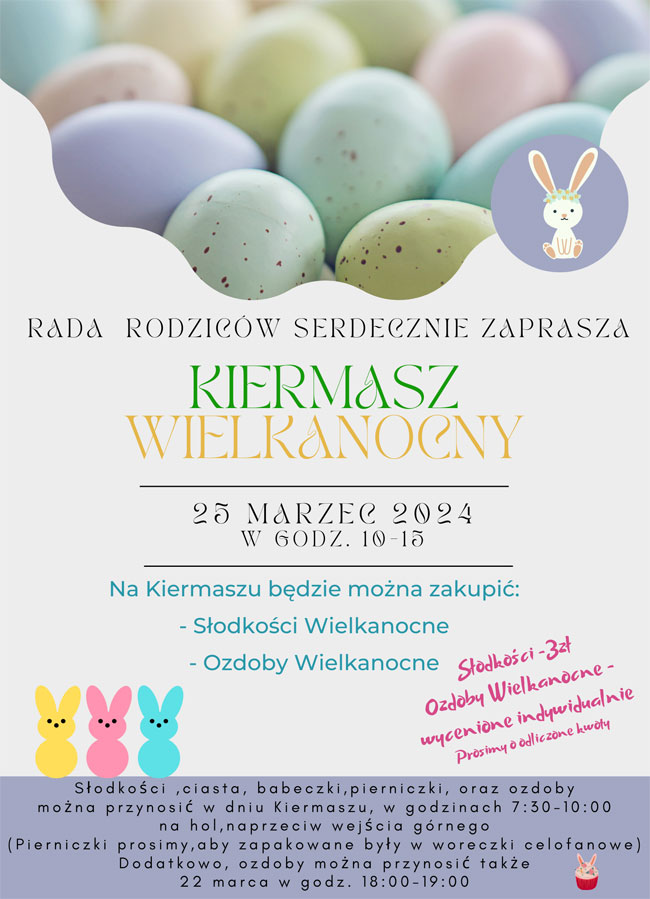 Rada Rodziców zaprasza całą społeczność szkolną na Kiermasz Wielkanocny Rady Rodziców, który odbędzie się już niedługo, w poniedziałek 25 marca, w godzinach 10-15.