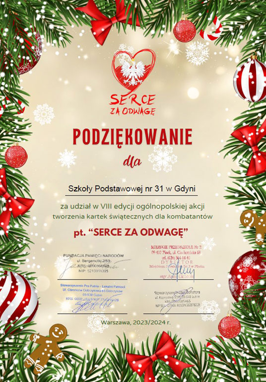 Nasza szkoła otrzymała podziękowanie za udział w akcji "SERCE ZA ODWAGĘ”, której celem było przygotowanie kartek świątecznych
